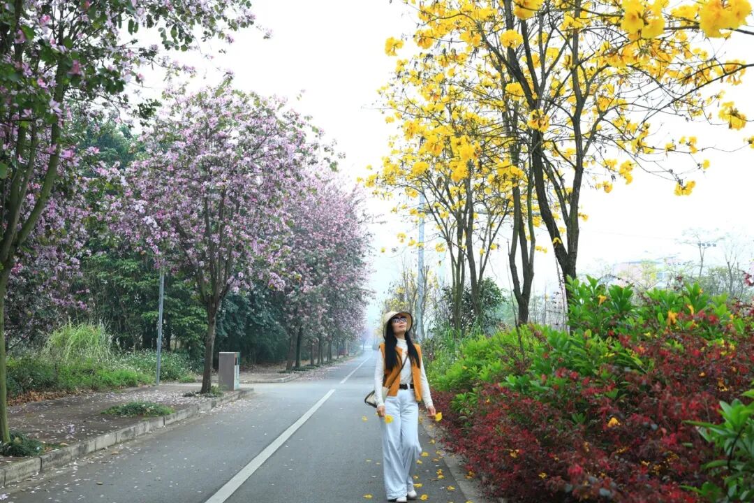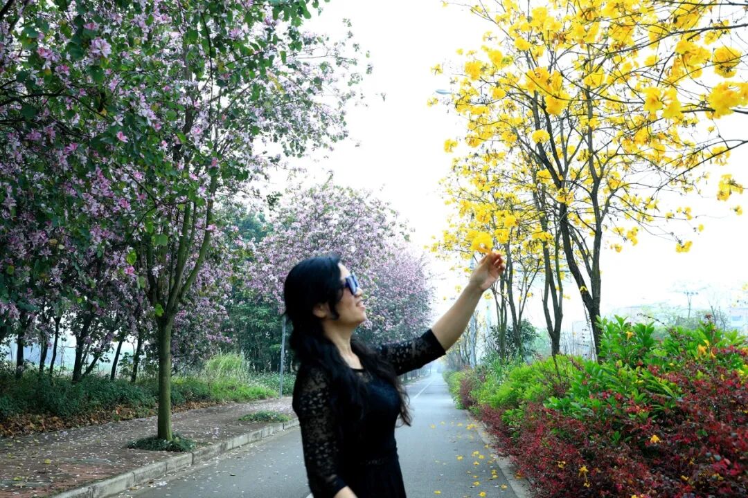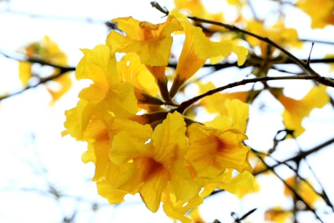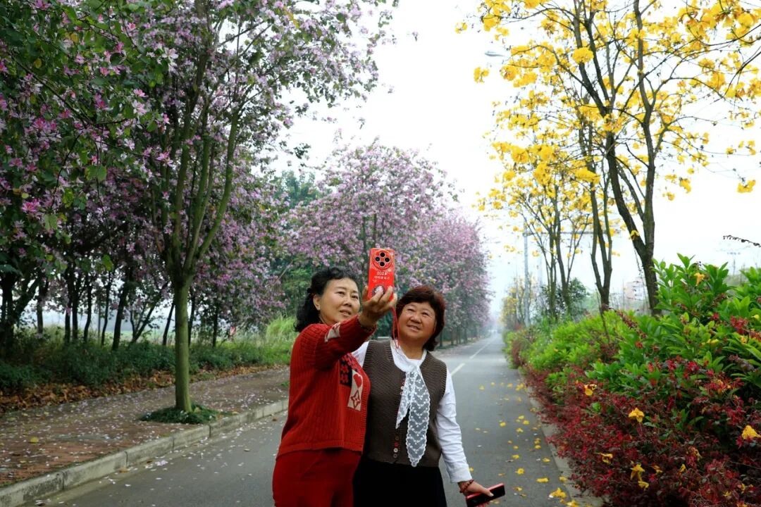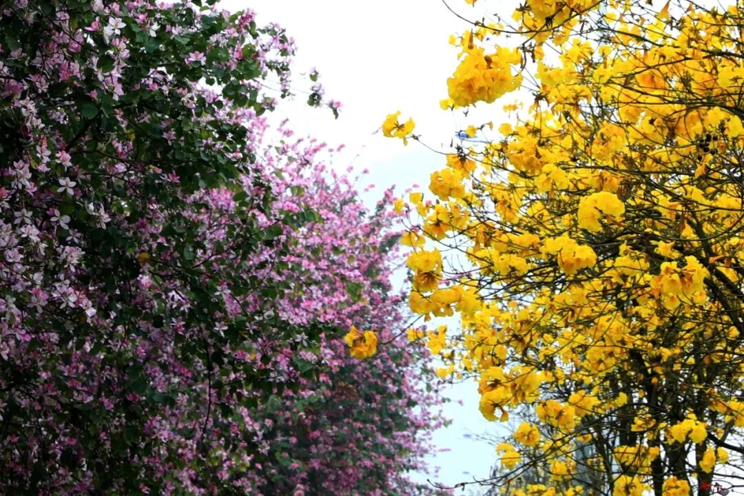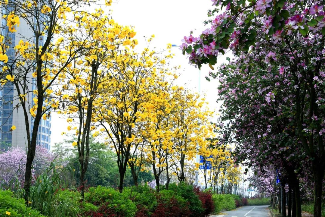 黄花风铃木花语为感谢、感恩,象征着希望与新生,寓意向阳而生、知恩图报。一树树金黄,是春天赠予城市的美好馈赠,也为市民带来温暖治愈的视觉享受。同期盛放的紫荆花,更让春日景致层次丰富,诗意盎然。