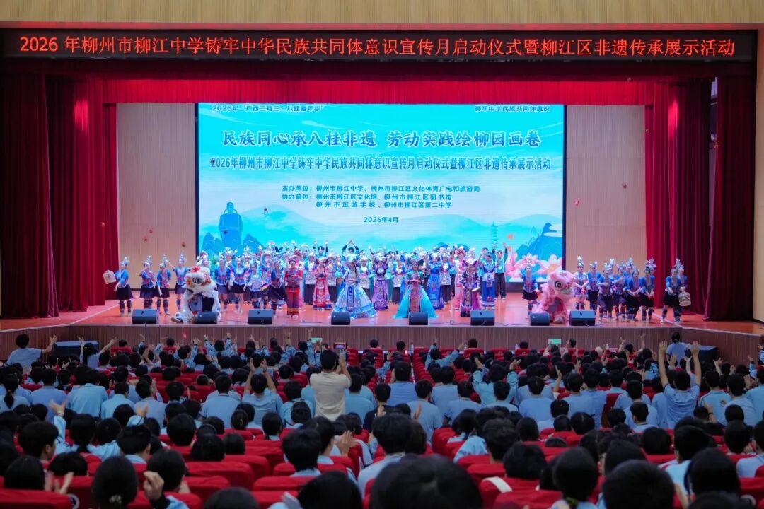 4月14日,柳州市柳江中学开展2026年铸牢中华民族共同体意识宣传月启动仪式暨柳江区非遗传承展示活动,依托“广西三月三”节庆契机,将民族团结教育、劳动实践与非遗保护有机融合。