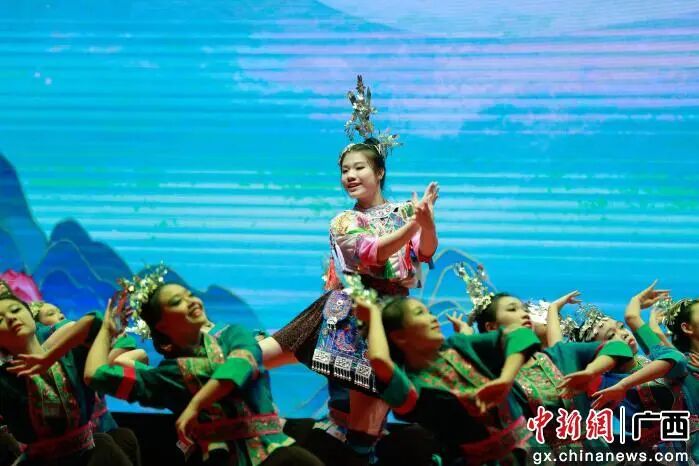 图为柳州市思贤中学学生在进行民族歌舞表演。