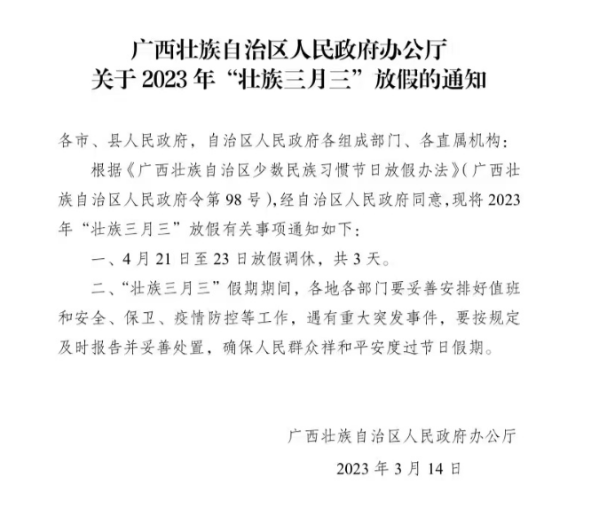 3月14日,记者从有关部门获悉,《广西壮族自治区人民政府办公厅关于2023年“壮族三月三”放假的通知》出炉。今年“壮族三月三”,4月21日至23日放假调休,共3天。