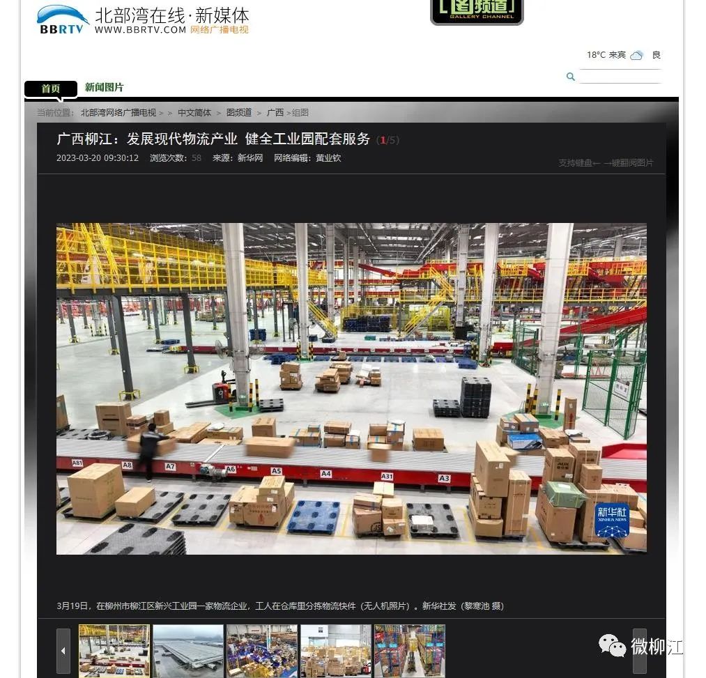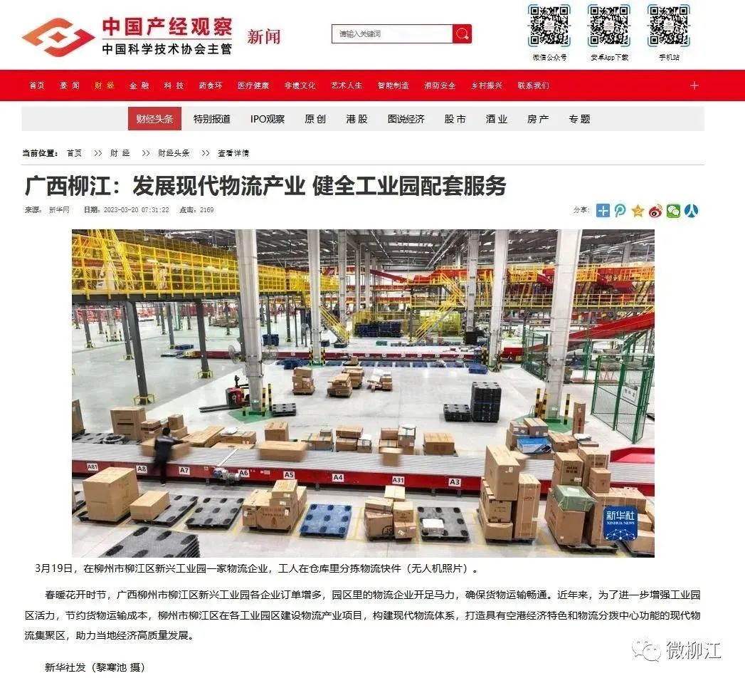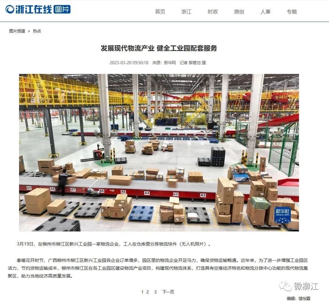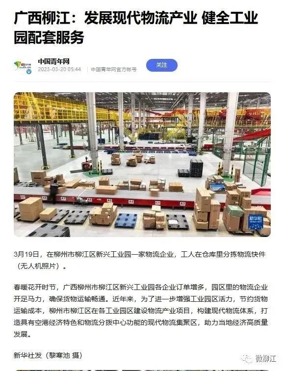 3月20日,新华社播发图片通稿报道《广西柳江:发展现代物流产业 健全工业园配套服务》,关注柳州市柳江区为了进一步增强工业园区活力,节约货物运输成本,在各工业园区建设物流产业项目,构建现代物流体系,打造具有空港经济特色和物流分拨中心功能的现代物流集聚区,助力当地经济高质量发展。报道在新华社客户端播发后,24小时内浏览量超150万人次。获新华网、央广网、中国政府网、中国青年网、中国网、中国产经观察新闻网、《工人日报》《梅州日报》、北部湾在线、浙江在线、腾讯网、《中山日报》《南国今报》等多家媒体转载报道。