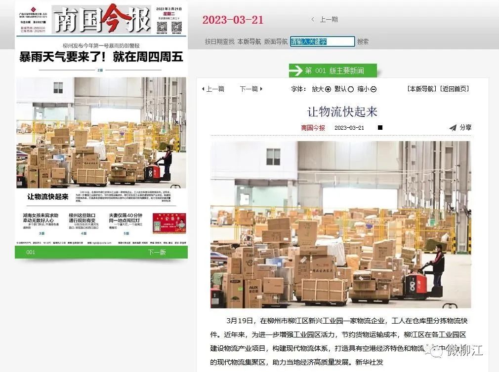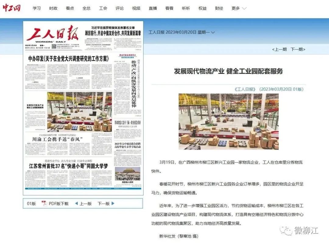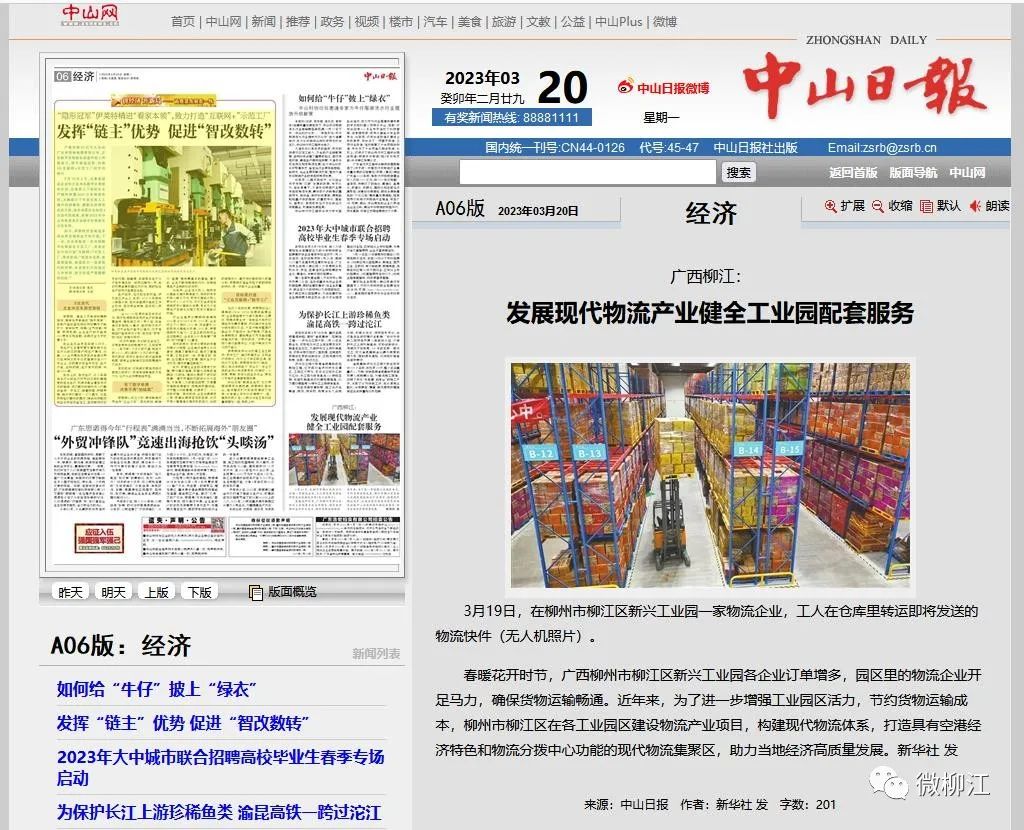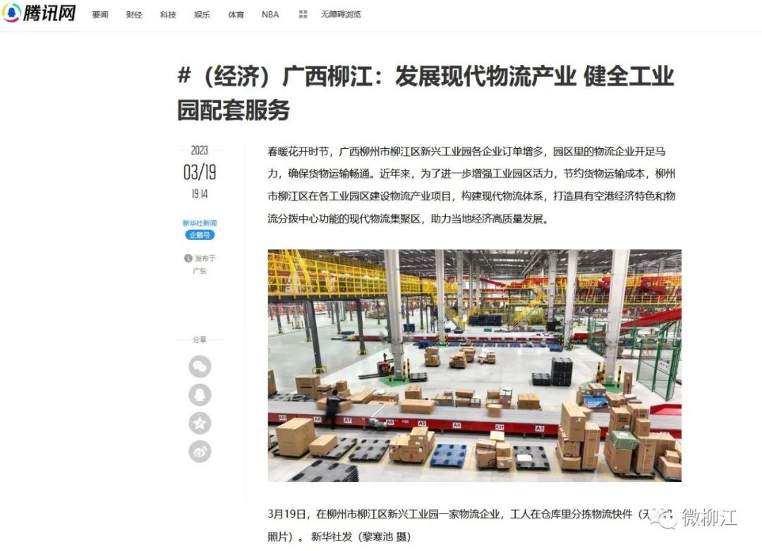 3月20日,新华社播发图片通稿报道《广西柳江:发展现代物流产业 健全工业园配套服务》,关注柳州市柳江区为了进一步增强工业园区活力,节约货物运输成本,在各工业园区建设物流产业项目,构建现代物流体系,打造具有空港经济特色和物流分拨中心功能的现代物流集聚区,助力当地经济高质量发展。报道在新华社客户端播发后,24小时内浏览量超150万人次。获新华网、央广网、中国政府网、中国青年网、中国网、中国产经观察新闻网、《工人日报》《梅州日报》、北部湾在线、浙江在线、腾讯网、《中山日报》《南国今报》等多家媒体转载报道。