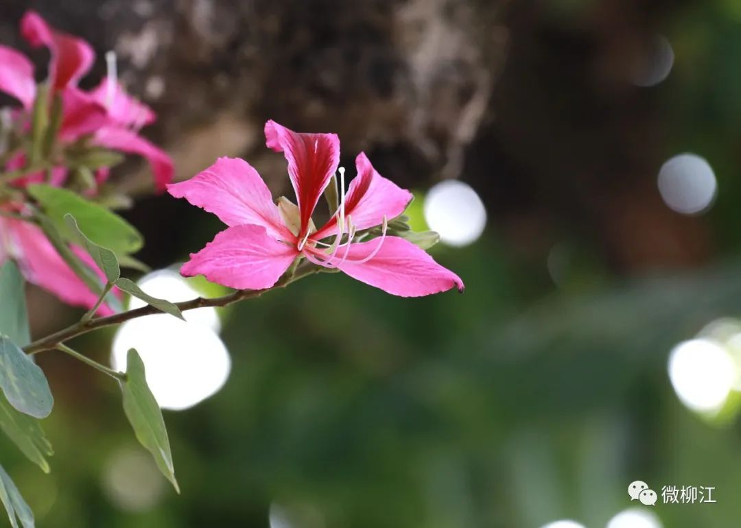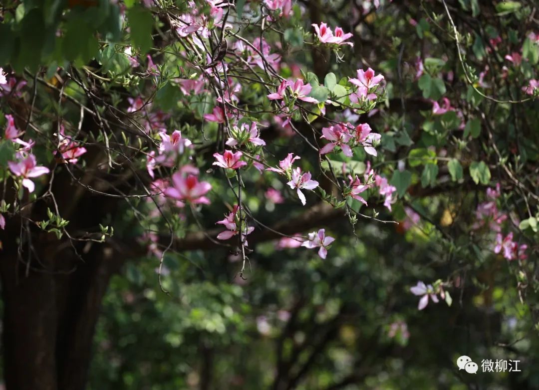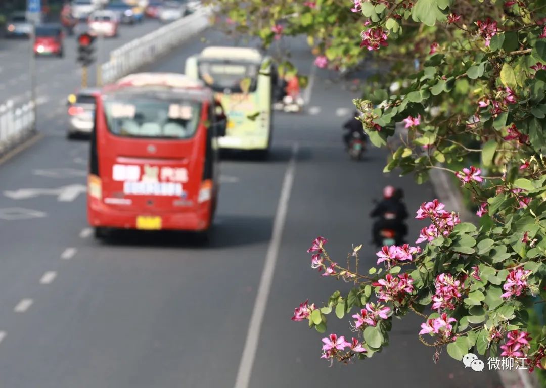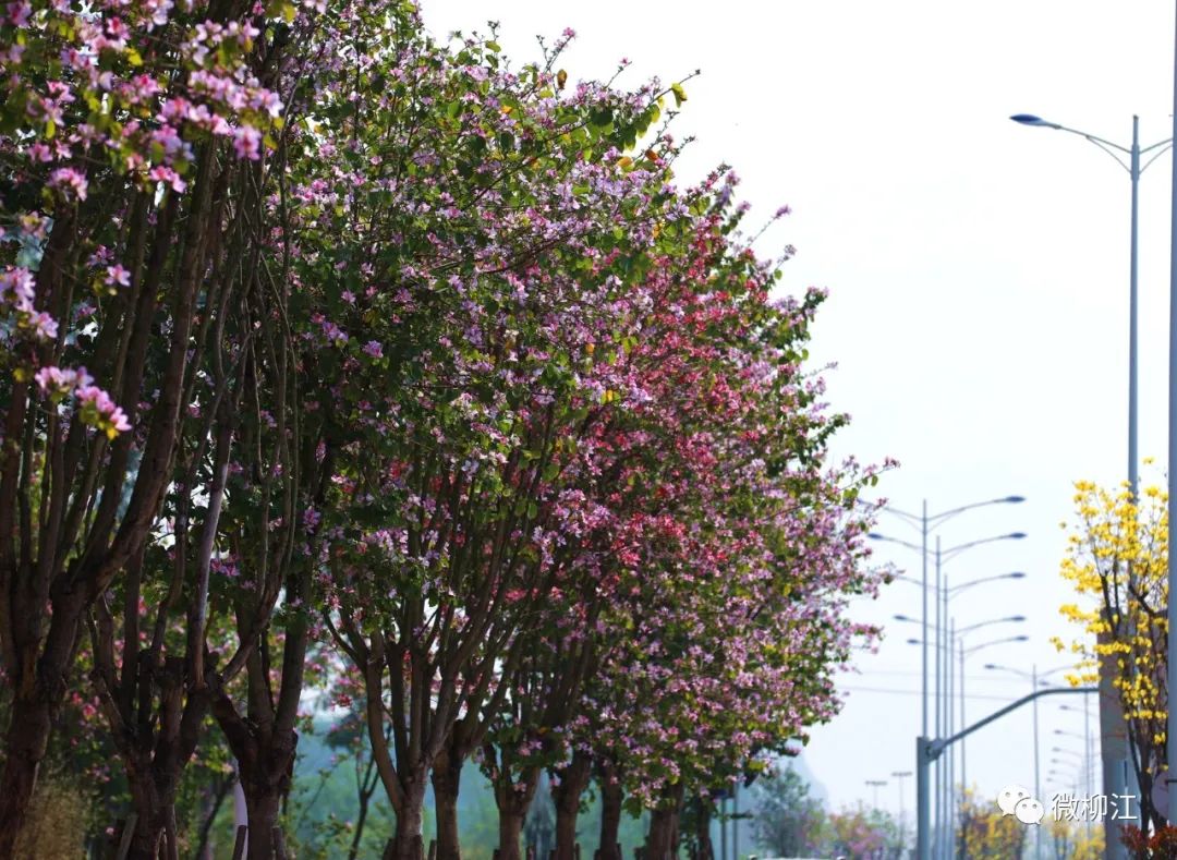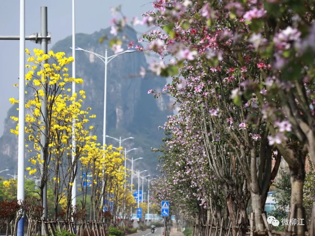 在柳江新城区兴柳路、南一路、南三路主干道,这里一路繁花似锦,南三路一公里的黄花风铃木与粉色的紫荆花金粉相拥,在这骑行或是散步,都是不错的选择。