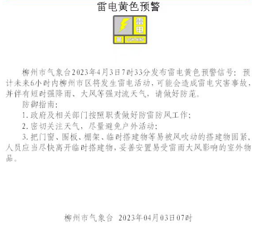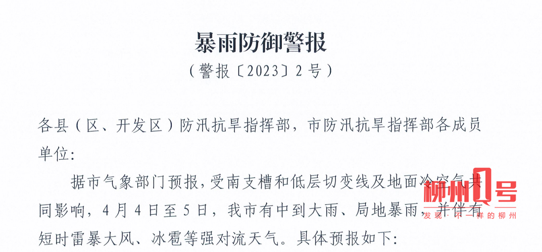 4月2日下午,柳州市防汛抗旱指挥部办公室发布今年第二号暴雨防御警报。据市气象部门预报,受南支槽和低层切变线及地面冷空气共同影响,4月4日至5日,我市有中到大雨、局地暴雨,并伴有短时雷暴大风、冰雹等强对流天气。