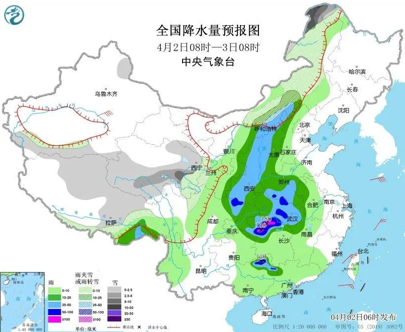 4月2日至5日,甘肃东部、宁夏、河北北部和内蒙古中东部等地有中到大雪或雨夹雪,内蒙古中部等地局地暴雪或大暴雪,主要降雪时段为4月2日至3日;西北地区东南部、西南地区东部、江汉、江淮、江南、华南、黄淮以及东北地区南部等地有中到大雨,河南、湖北、湖南、安徽、江西、浙江、广西、广东和福建等地的部分地区有暴雨,局地大暴雨,主要降雨时段为4月2日至4日。