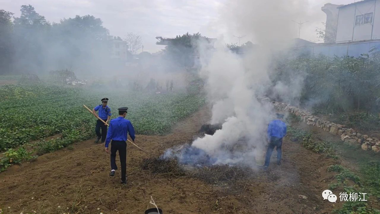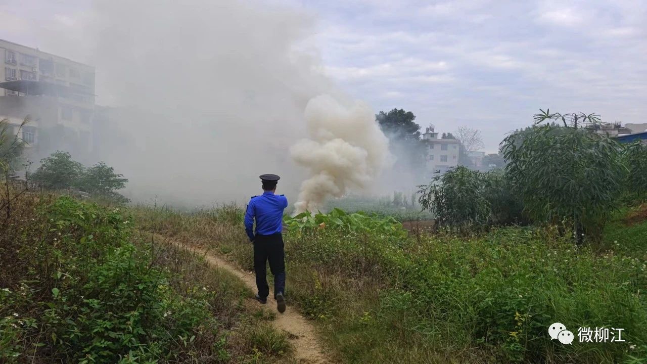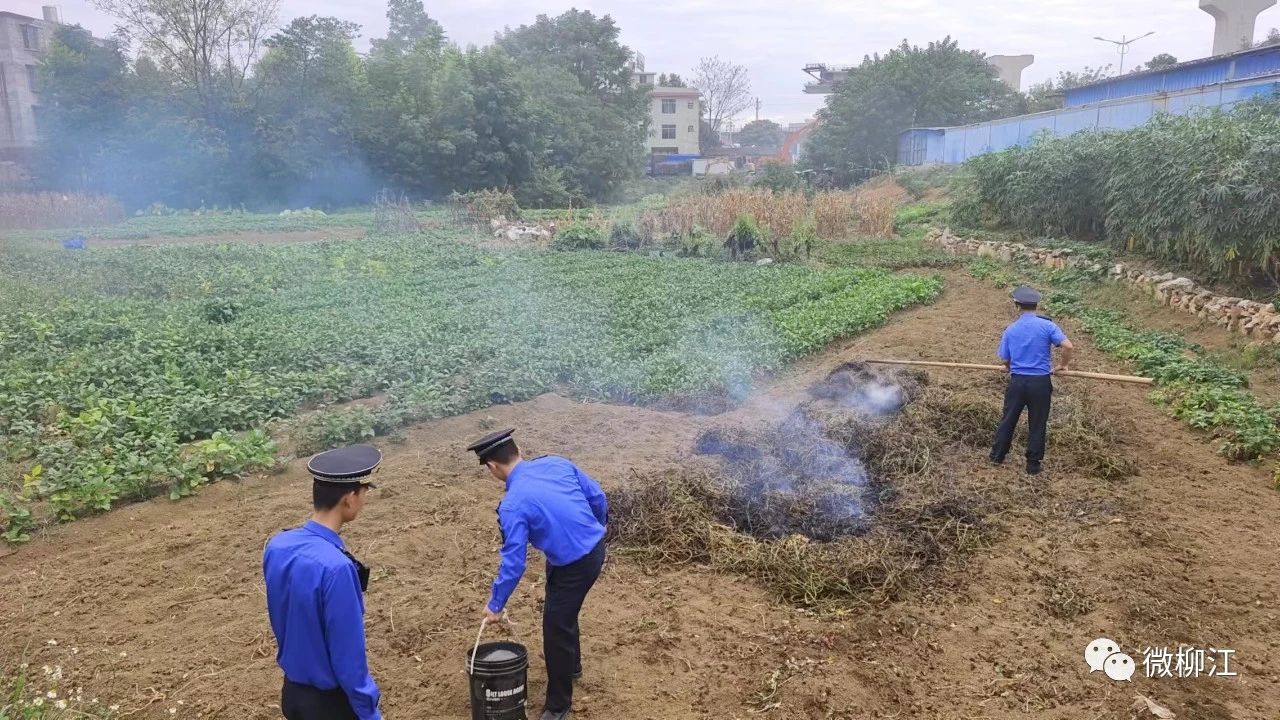 11月13日,柳江区城管执法局接到政府热线投诉,称在柳江区西二路附近有人焚烧秸秆,现场产生大量浓烟和臭味。接报后,执法人员速往现场查看,顺着浓烟方向找到一处农田秸秆焚烧点,目测着火面积约2平方米,现场无当事人。