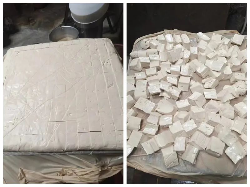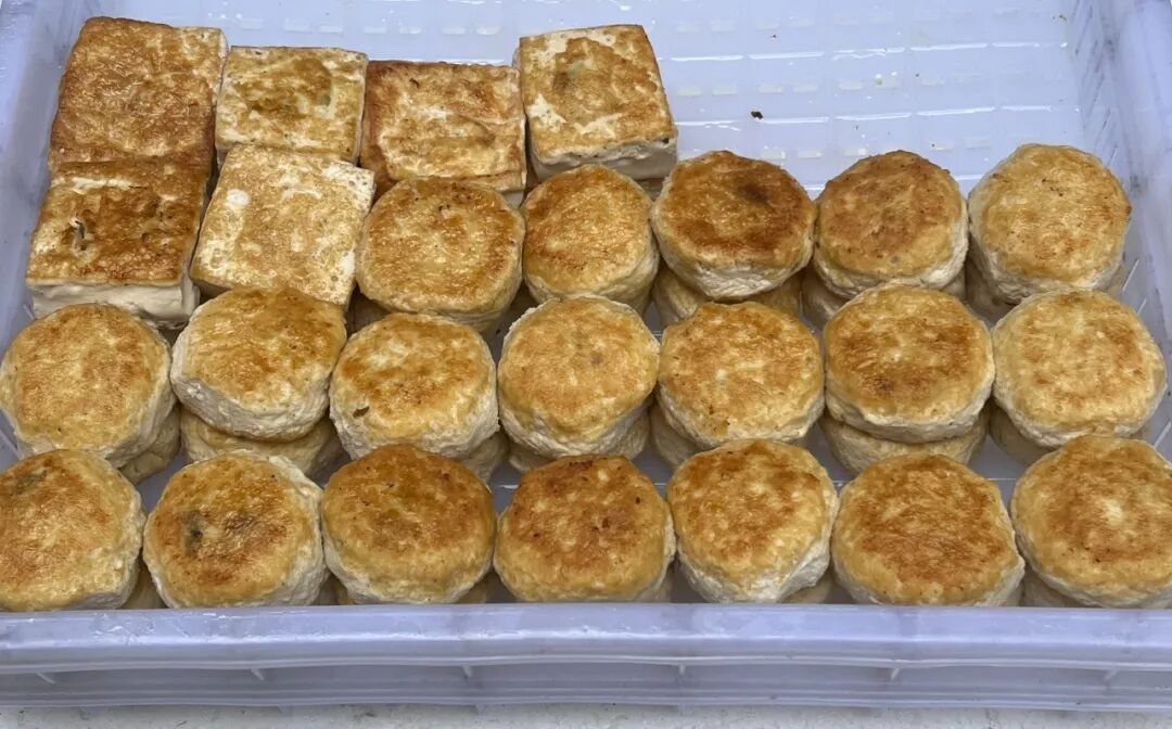 土博豆腐酿的制作过程并不复杂。首先,将晾晒干后的黄豆磨成细腻白嫩的豆腐。接着,将豆腐用手轻轻抓成小块,捏成碗状,再将馅料包裹在其中。最后,把它们揉成一个个饼的形状,放入油锅,用小火煎至两面金黄。就这样,一道可即食、可火锅、可烧烤的豆腐酿便制作完成。