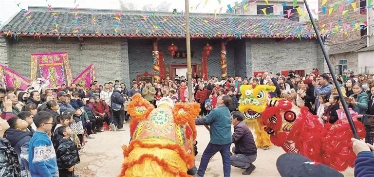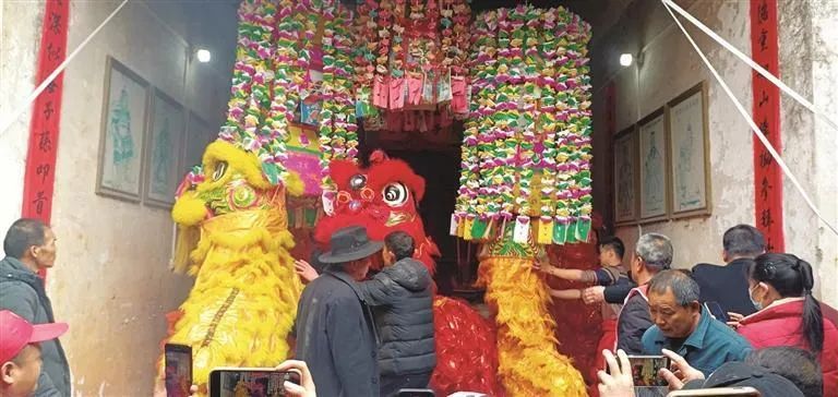 随后举行的“上灯”仪式将活动推向了高潮。“上灯”又称“升灯”“点灯”,是客家地区古老而隆重的传统习俗。在客家话中,“灯”与“丁”谐音,寓意着人丁兴旺、家族昌盛。仪式上,村民们将去年悬挂的旧花灯取下,众人争相抢夺,抢到了花灯就寓意抢到好运。之后,村民将新花灯高高挂起,祝福人丁兴旺、平安吉祥。醒狮表演是“上灯”仪式中的重要内容。伴随着铿锵有力的锣鼓声,醒狮队伍进行了威风凛凛、气势雄壮的表演,赢得现场观众的阵阵掌声。