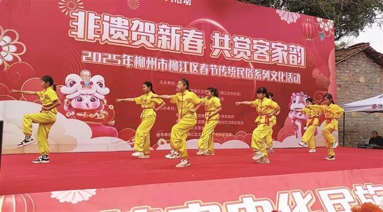 2月9日,柳江区进德镇四连村土垢屯举行以“传承民俗文化,共庆新春佳节”为主题的民俗活动。活动在充满客家风情的文化展演中拉开帷幕,客家武术表演、舞蹈《客家车马舞》、山歌《歌王送祝福》等节目轮番上演,现场喜庆祥和、热闹非凡。