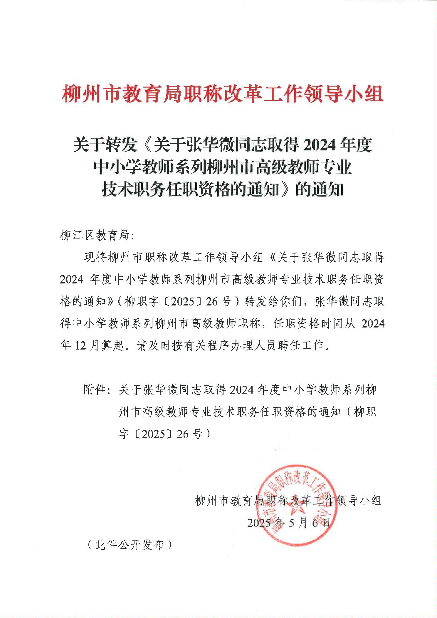柳职字〔2025〕26号关于张华微同志取得2024年度中小学教师系列柳州市高级教师专业技术职务任职资格的通知.pdf