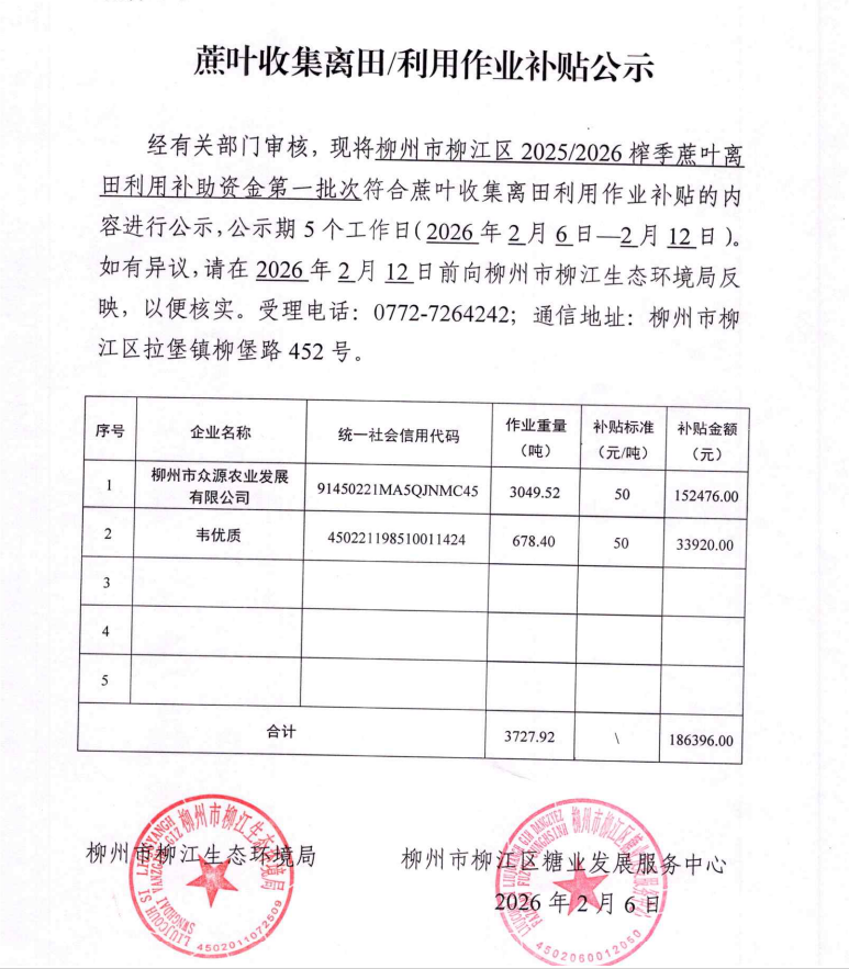 柳州市柳江区2025/2026榨季蔗叶离田利用补助资金第一批次公示