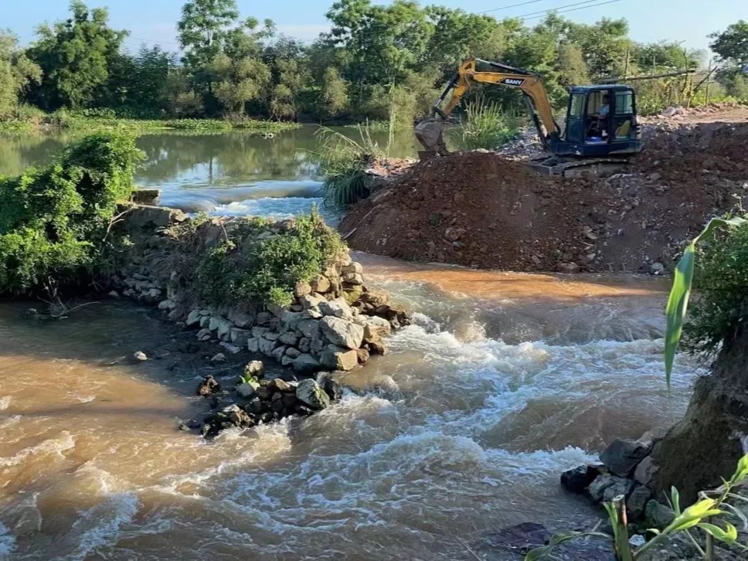 7月12日,抢修队顶着高温烈日,调来挖机、铲车开始动工,上午储备土方,下午开始回填。随着坝体缺口收紧,水流就越来越湍急,土方流失量就越大,修复施工难度就越大。在施工队持续奋战9个多小时后,直到晚上9点,被冲垮的坝体才得到修复。