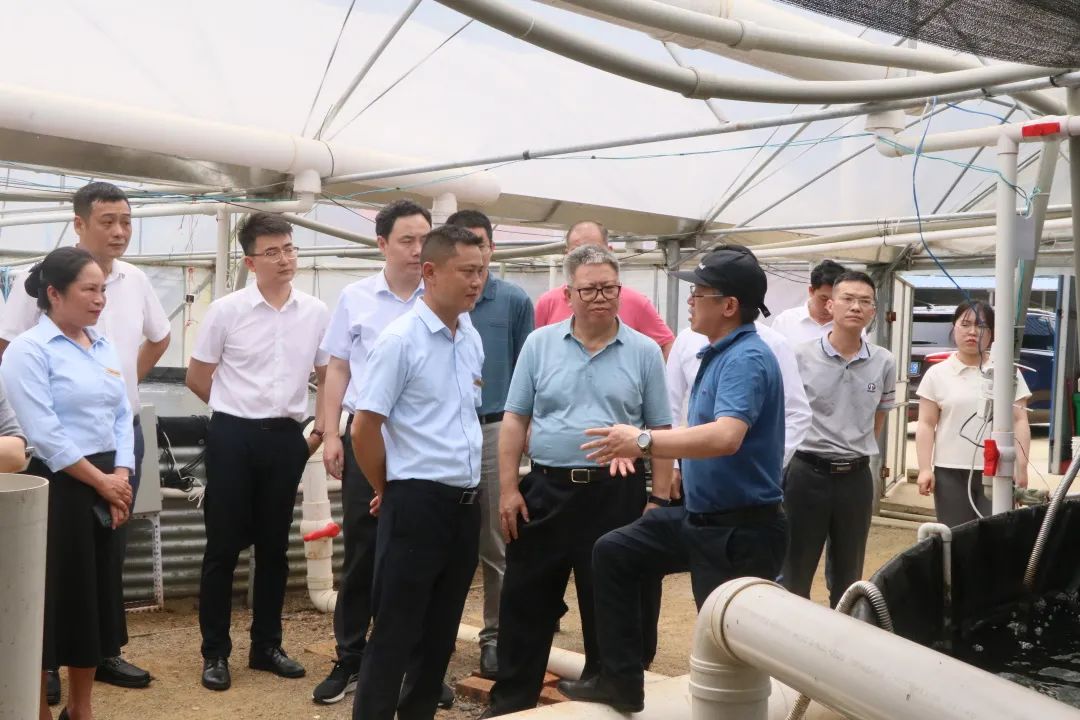 5月18日,中国水产科学研究院党组书记、副院长陈金发,自治区农业农村厅副厅长、党组成员梁纪豪,自治区水产科学研究院党委书记江林源等一行10人莅临成团镇绿嘉园生态农业产业园调研陆基圆池对虾养殖基地发展情况。