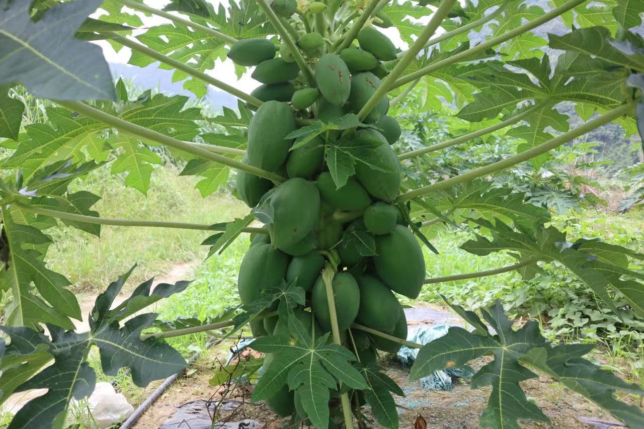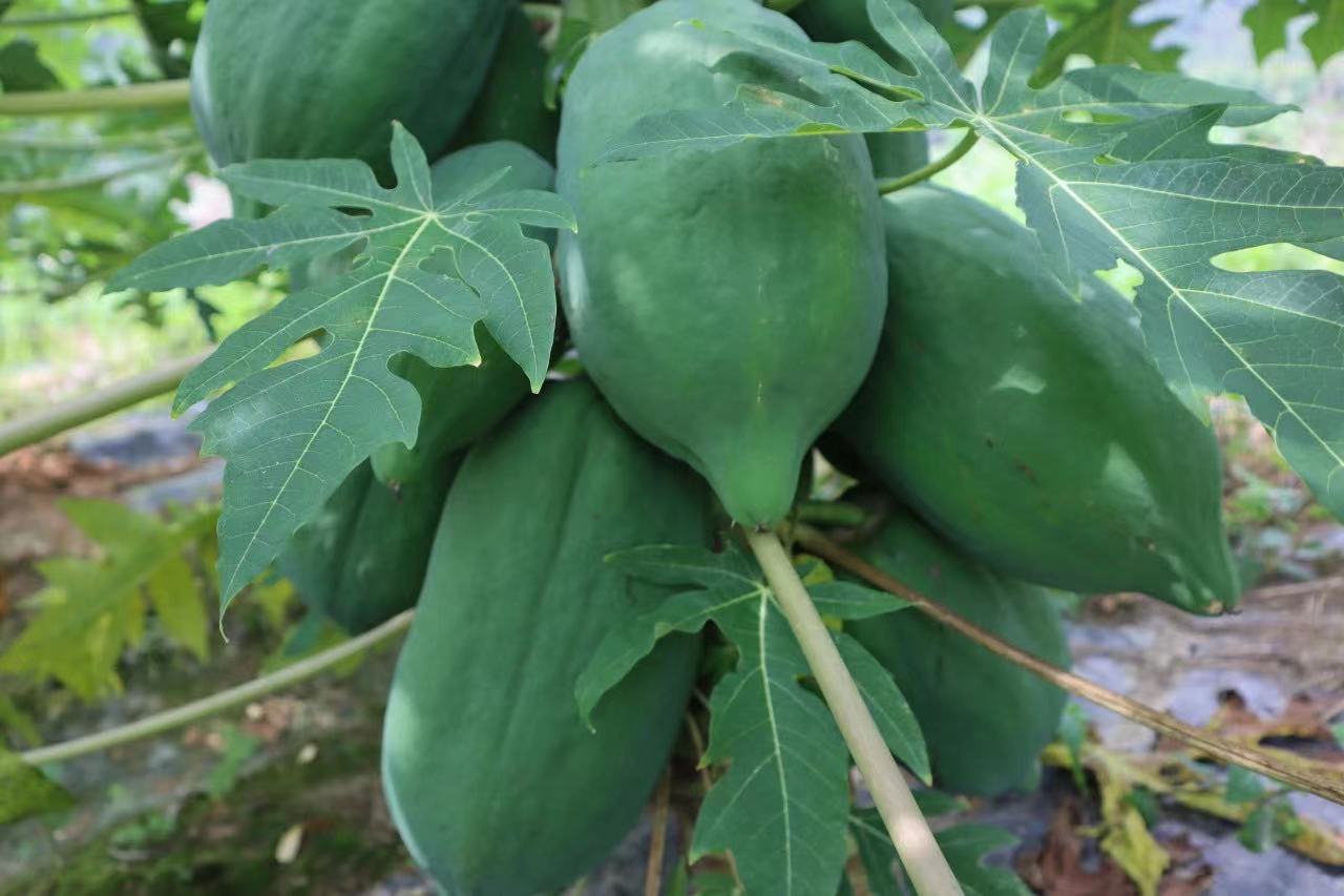 走入青木瓜种植基地,首先映入眼帘的是整片绿油油,生机勃勃的青木瓜树群,再走近看,每棵青木瓜树都挂满了肥大而又饱满的果实,像青色的大梨,像肥硕的龙鳞,饱满的果实里充满了清香的汁水。