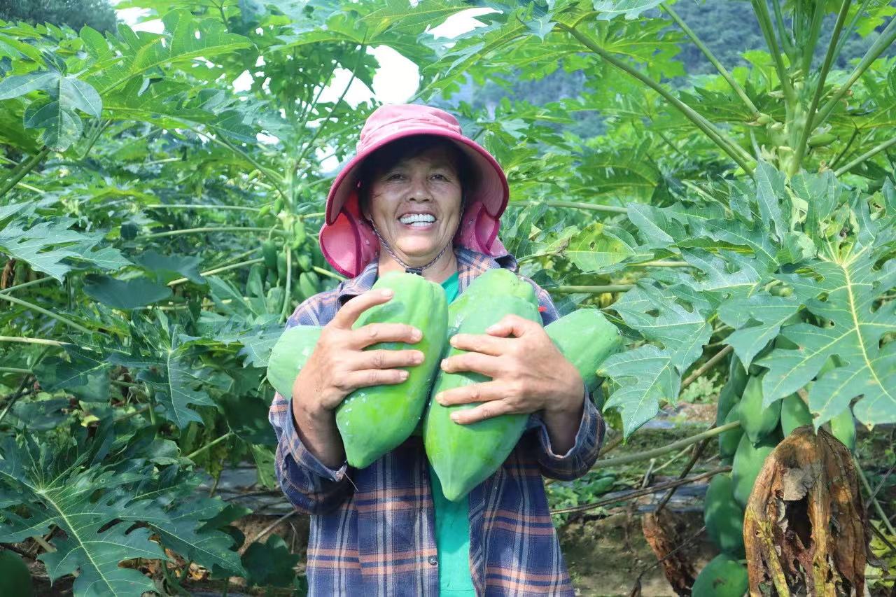 在基地采收木瓜的王双林笑着说:“有搞头,明年继续在租赁的70亩土地上扩种青木瓜品种”。