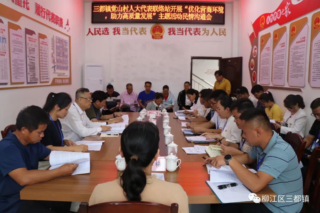民情沟通会上,人大代表们听取了三都镇人大主席潘晓静通报三都镇觉山村人大代表联络站2022年重点建议落实情况,并开展满意度测评。镇党委副书记、镇长周毅向代表们汇报三都镇开展“优化营商环境,助力高质量发展”的工作情况,代表们围绕主题,结合实际开展讨论,积极建言献策。相关部门负责人针对意见建议,一一给予回应解答。会上还征求对《广西壮族自治区生态文明建设促进条例(草案)》的意见建议,并讨论通过联络站提出的重点建议。