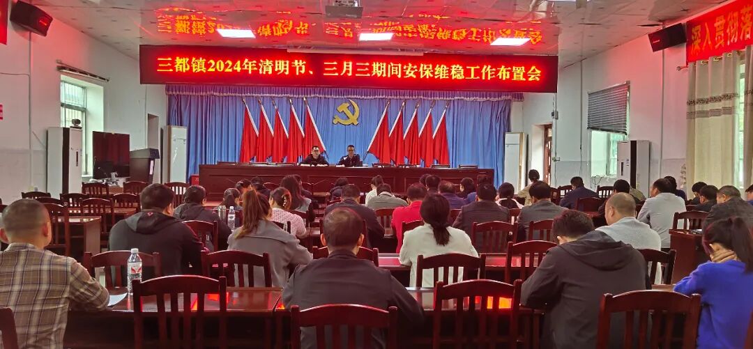 为进一步提高政治站位,保持清醒头脑,增强风险意识,全力维护清明节、“三月三”期间社会大局稳定,4月9日,三都镇组织召开2024年清明节、“三月三”期间安保维稳工作布置会,镇全体班子成员、各村(社区)党支书、工作队长、警务助理、禁毒社工参加会议。