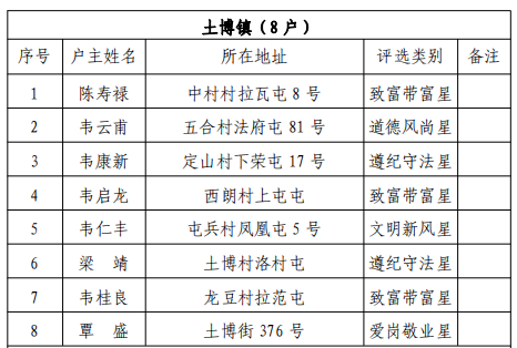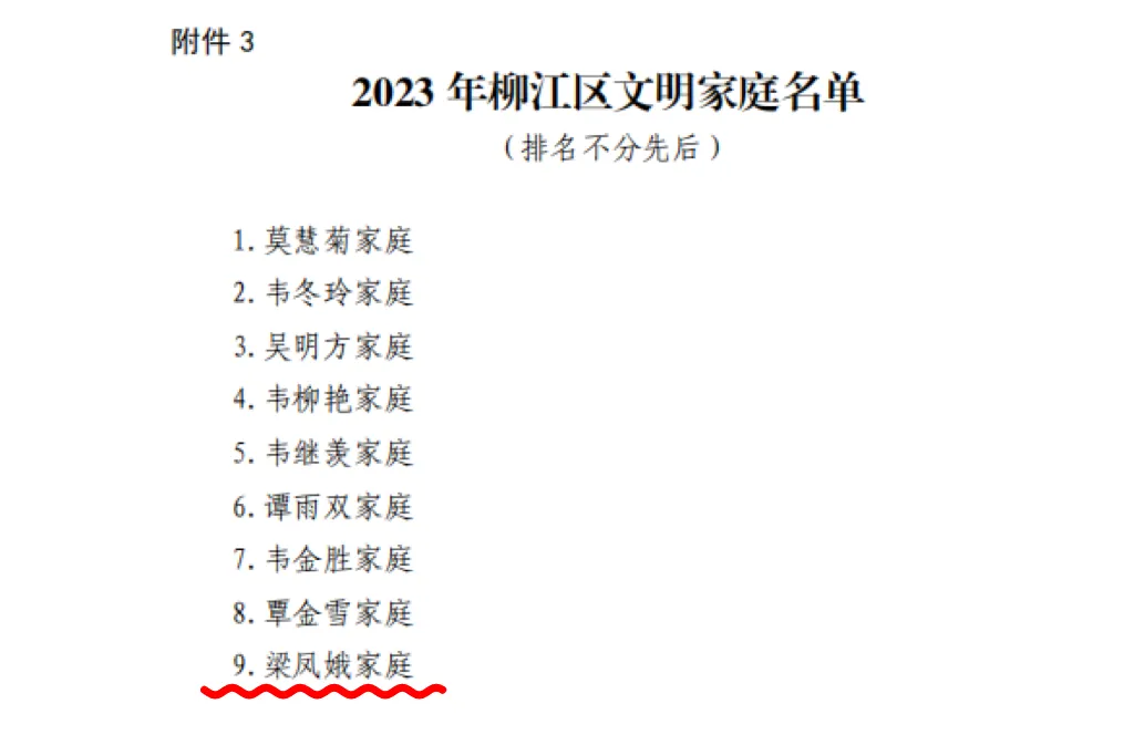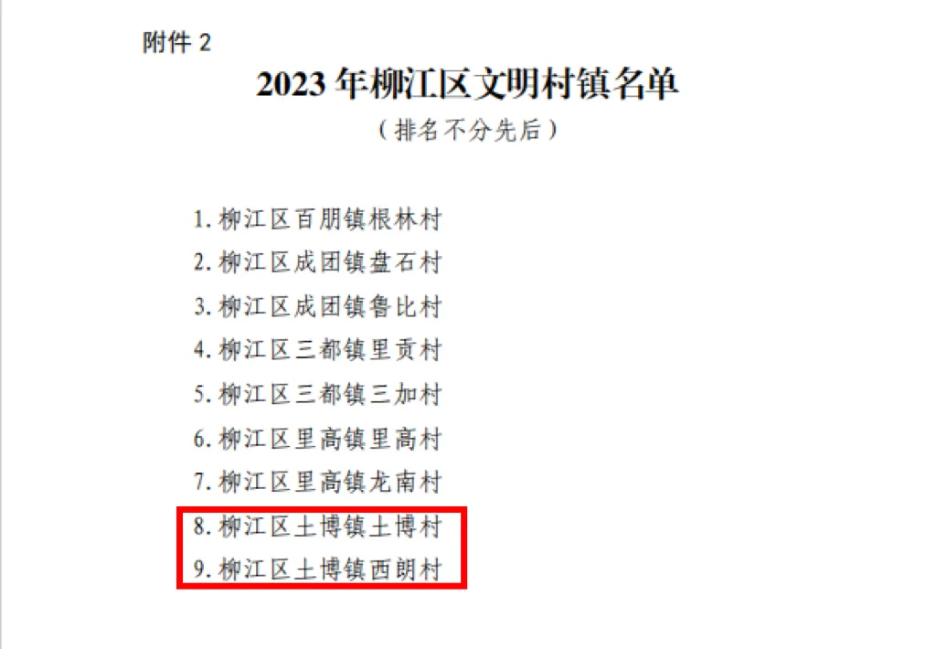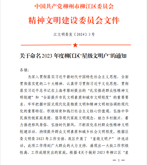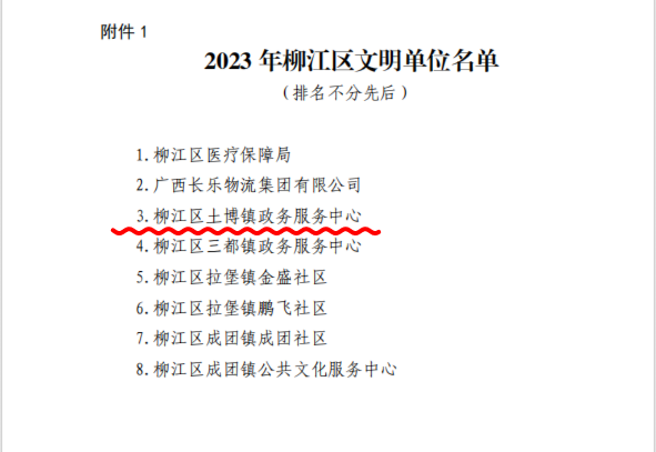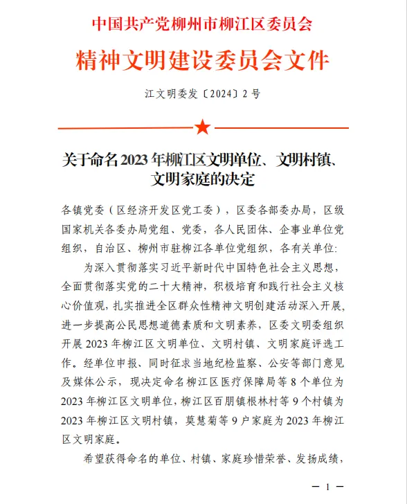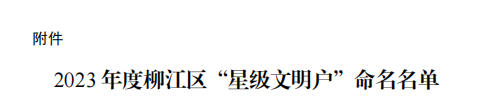 根据中国共产党柳州市柳江区委员会精神文明建设委员会《关于命名2023年度柳江区“星级文明户”的通知》和《关于命名 2023 年柳江区文明单位、文明村镇、文明家庭的决定》文件精神,为激励先进、树立典型,推动全区“星级文明户”“文明单位”等创建工作深入开展,决定命名柳江区67户家庭、8个单位为2023年度柳江区“星级文明户”“文明单位”。土博镇陈寿禄等8户获命名为2023年度柳江区“星级文明户”,柳江区土博镇政务服务中心获命名为"2023年柳江区文明单位",柳江区土博镇土博村、西朗村获命名为"2023年柳江区文明村镇",梁凤娥家庭获命名为“2023年柳江区文明家庭”。