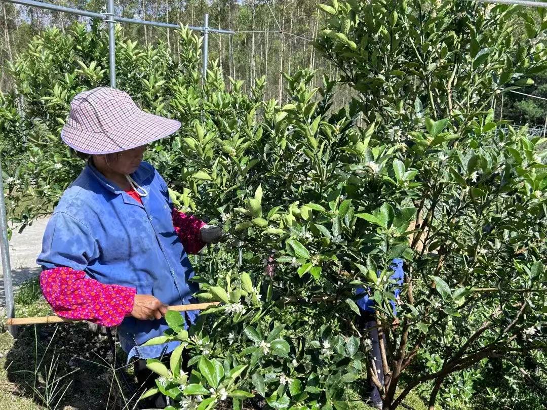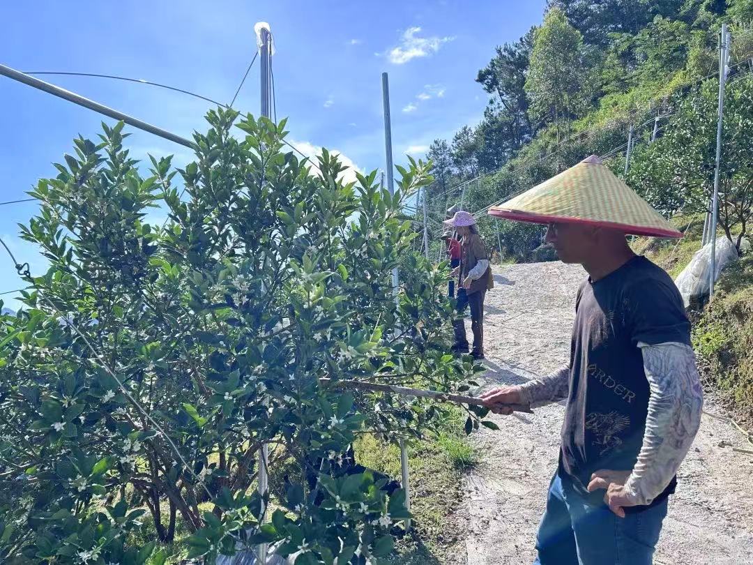 “抹芽要注意根据枝条密度和树势,将多余的零星嫩芽及时抹除,一般一根枝条保留2-3个芽,留下的芽要避免出现交叉的情况。等梢长至2-3厘米时,再及时疏芽,调整枝梢。”土博镇甘贡村党支书韦柳平正在指导着。