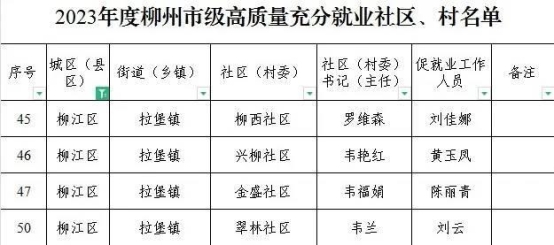 近日,柳州市人力资源和社会保障局正式公布《关于公布 2023年度柳州市级高质量充分就业社区名单的通知》,柳江区拉堡镇柳西社区、兴柳社区、金盛社区、翠林社区荣获2023年度柳州市级高质量充分就业社区称号!
