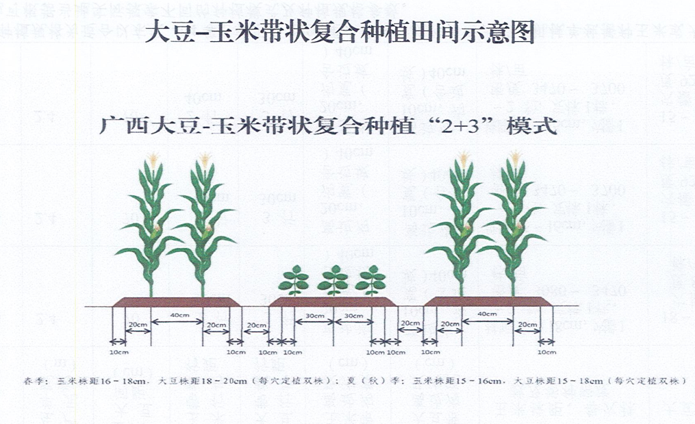选择“2+3”模式,2行玉米+3行大豆,实行2行玉米带与3行大豆带复合种植;或者选择“2+4”模式,2行玉米+4行大豆,实行2行玉米带与4行大豆带复合种植。(行距标准参照下图)