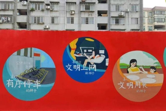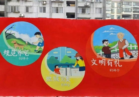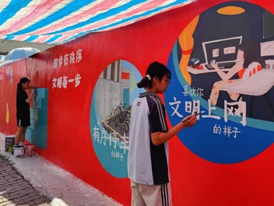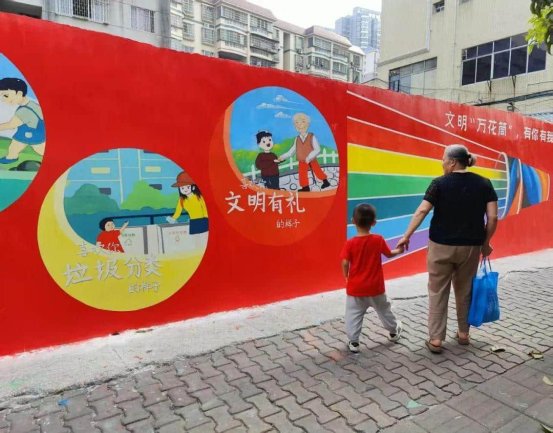 在亲子志愿者们的巧手改造下,原本单调的墙体焕然一新,化作一幅“会说话”的“文明画卷”,既美化了环境,又成为倡导文明、传递温暖的新地标!