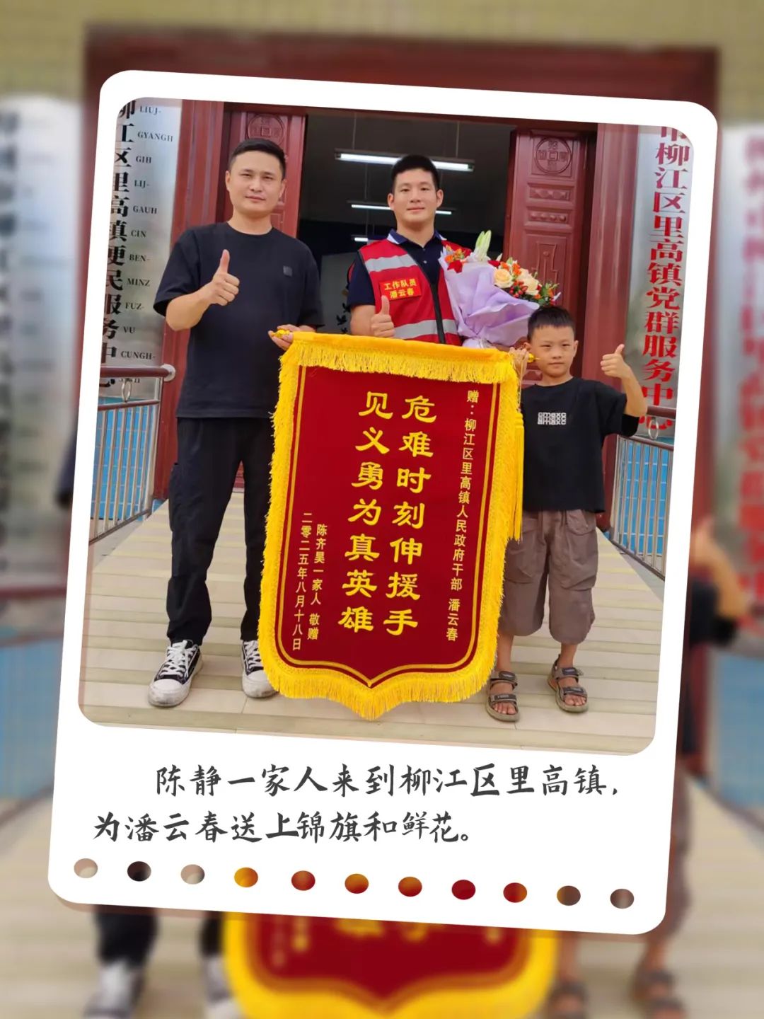 8月22日,在柳州经商的陈静一家驱车专程来到柳州市柳江区里高镇。他们手捧鲜花,将一面写有“危难时刻伸援手,见义勇为真英雄”的锦旗,郑重送到里高镇综合行政执法队干部、退伍军人潘云春手中。