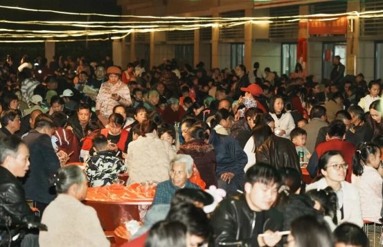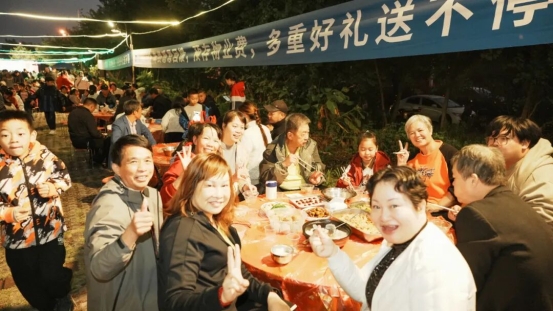 傍晚6点,百家宴正式开席。业主共享杀猪宴与精彩的节目表演,各家各户也纷纷端出精心准备的拿手菜肴。一声“开席喽——”伴着扑鼻香气传遍小区,150张餐桌蜿蜒排开,平时擦肩而过的邻居,变成了同桌吃饭的“一家人”。