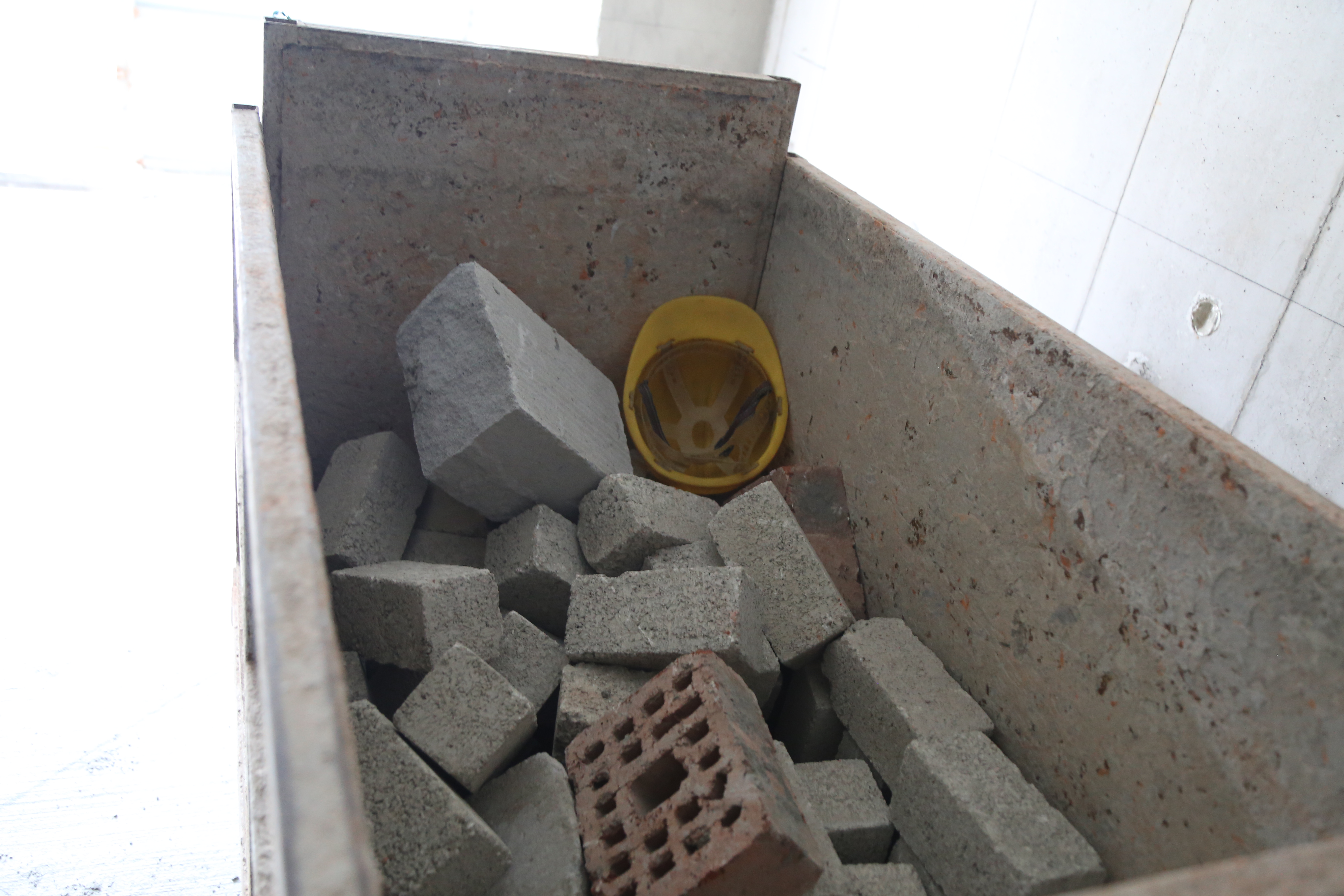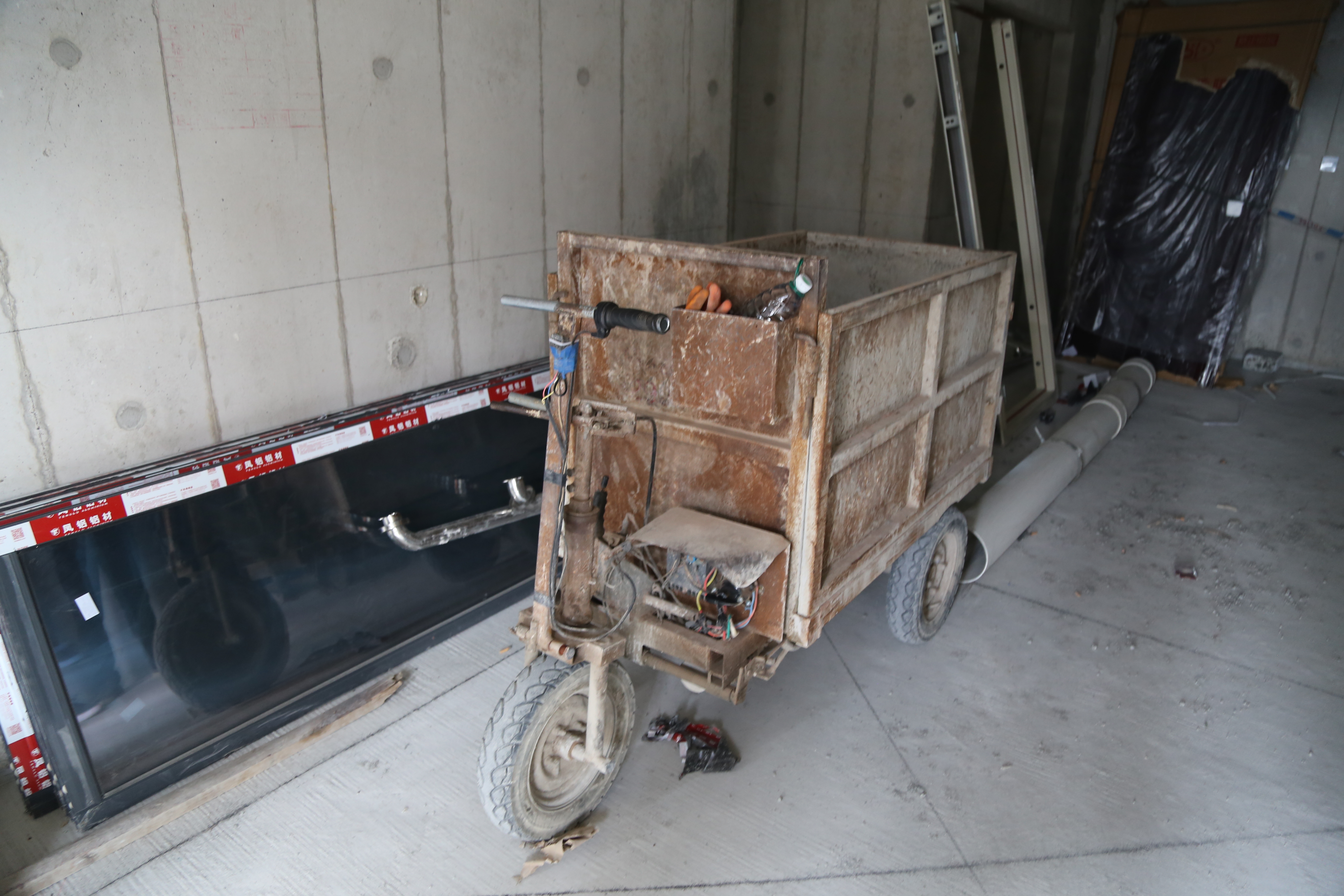 事故地点位于柳江区金湾御府项目工地14栋26层(图1),经现场勘查,死者躺在该工地14号楼26层电梯前室,死者头朝南脚朝北仰卧于走道地面,身下垫有硬纸壳,死者身上衣服无血迹,现场西南侧房间内有一辆工地电动手推车,工地电动手推车长度约为1.84米,车厢宽度约为0.73米,车厢距离地面的高度约为1.2米,(空车)车身重约200Kg(图2),车厢内装载半车建筑垃圾(图3)。