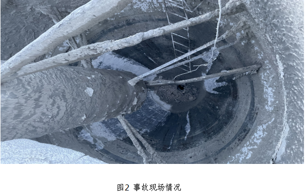 2.事故现场情况:(1)储浆罐上部分呈圆柱形,下部罐底呈下锥形,罐顶无盖呈开放式,罐内有一部活动钢筋制爬梯搭在罐内固定爬梯下部延伸至罐底,罐内壁四周附着有一层泥浆,罐底残留有部分泥浆,泥浆呈水物混合物组成,泥浆部分已固化,罐底部有一根断掉的铁链(图2)。