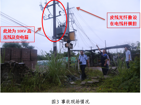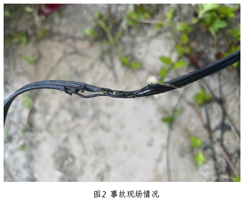 2.事故现场情况:(1)皮线光纤被高压电烧焦,皮线光纤被雨水淋湿(图2),皮线光纤敷设在电线杆横担上(图3)。