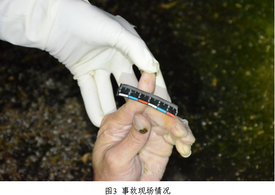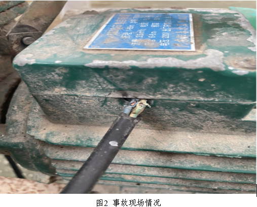2.事故现场情况:(1)鱼池内有一台1ZDB65型自吸泵抽水机,抽水机电线的连接部位铜线已裸露(图2),死者曾某德左手与左腰部位有电击伤痕(图3)。