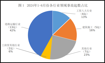 1-6月份,各重点行业中,有5个行业发生了生产安全事故:道路运输行业(事故13起、死亡17人,同比分别增加2起、增加3人,分别上升18.18%和21.43%)、建筑施工行业(事故5起、死亡3人,同比分别减少3起、减少4人,分别下降37.5%和57.14%。其中建筑装饰和装修事故3起,住宅房屋建筑事故1起,其他安装业事故1起)、工贸八大行业(事故4起、死亡3人,同比分别增加2起、增加2人,分别上升100%和200%)、工商贸其他行业(事故2起、死亡2人,同比分别减少3起、减少1人,分别下降60%和33.33%)、其他行业(事故7起、死亡6人,同比分别增加5起、增加5人,分别上升250%和500%)。金属非金属矿山、化工和烟花爆竹、水上运输、农业机械、铁路运输等5个行业领域未发生生产安全事故。