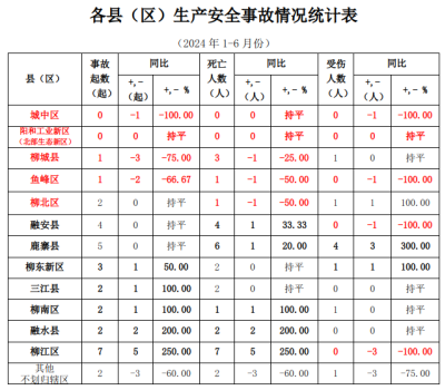 1-6月份,12个县(区)中有10个县(区)发生了生产安全事故:柳江区发生事故7起、死亡7人,鹿寨县发生事故5起、死亡6人,融安县发生事故4起、死亡4人,柳东新区发生事故3起、死亡2人,融水县发生事故2起、死亡2人,三江县发生事故2起、死亡2人,柳北区发生事故2起、死亡1人,柳南区发生事故2起、死亡1人,柳城县发生事故1起、死亡3人,鱼峰区发生事故1起、死亡1人,其他不划归辖区(高速公路道路运输行业)事故2起、死亡2人,城中区和阳和工业新区(北部生态新区)等2个县(区)未发生生产安全事故。