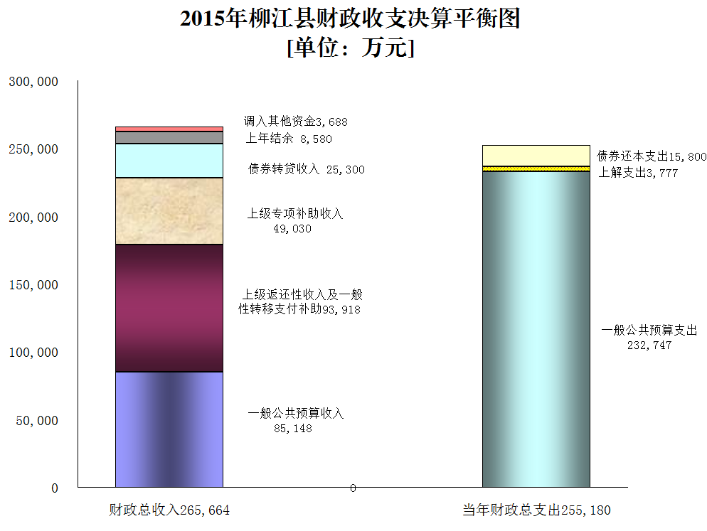 2015年,我县财政总收入265,664万元(当年地方财政总收入257,084万元,加上年结转收入8,580万元),减当年财政总支出255,180万元,减结转(专项结转)下年的支出10,484万元,当年财政收支平衡。