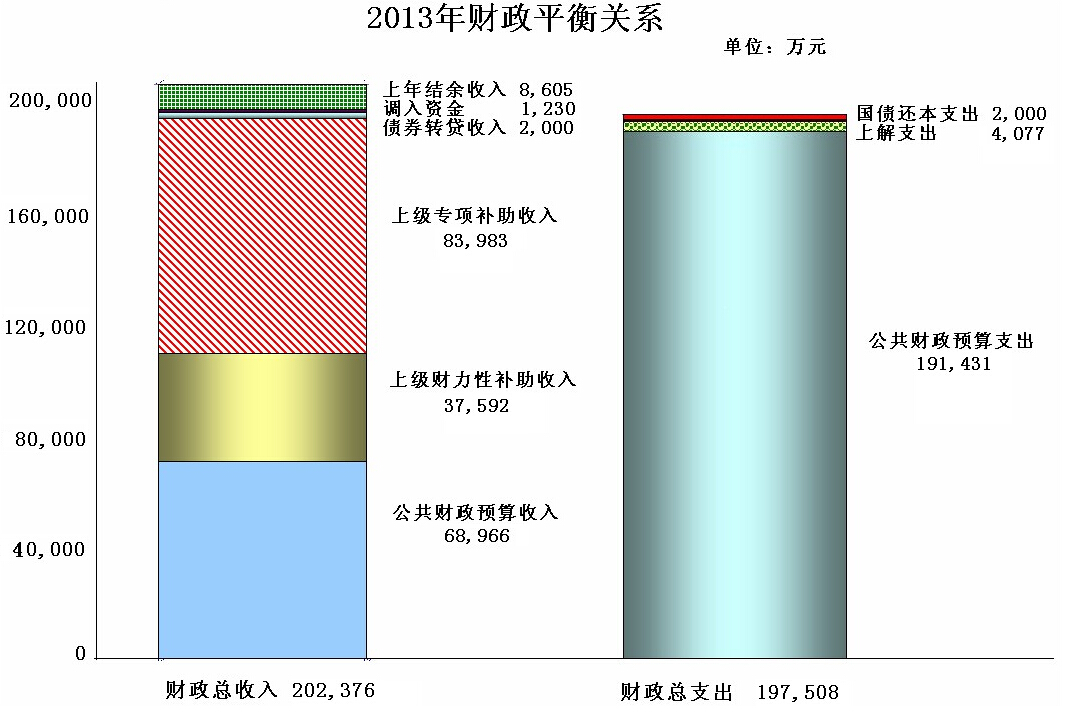 2013年,我县当年地方财政总收入193,771万元,加上年结转收入8,605万元,减当年财政总支出197,508万元,减结转(专项结转)下年的支出4,669万元,年终净结余199万元。当年财政收支平衡,并略有结余。