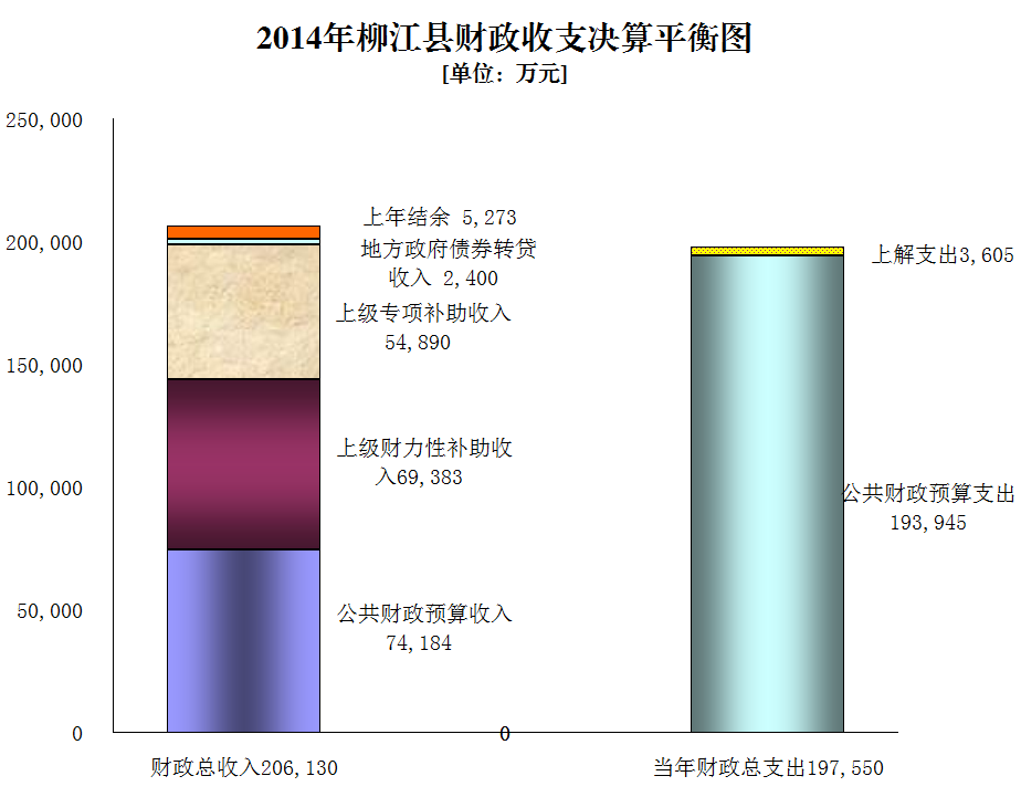 2014年,我县财政总收入206,130万元(当年地方财政总收入200,857万元,加上年结转收入5,273万元),减当年财政总支出197,550万元,减结转(专项结转)下年的支出6,315万元,年终净结余2,265万元。当年财政收支平衡,并有结余。