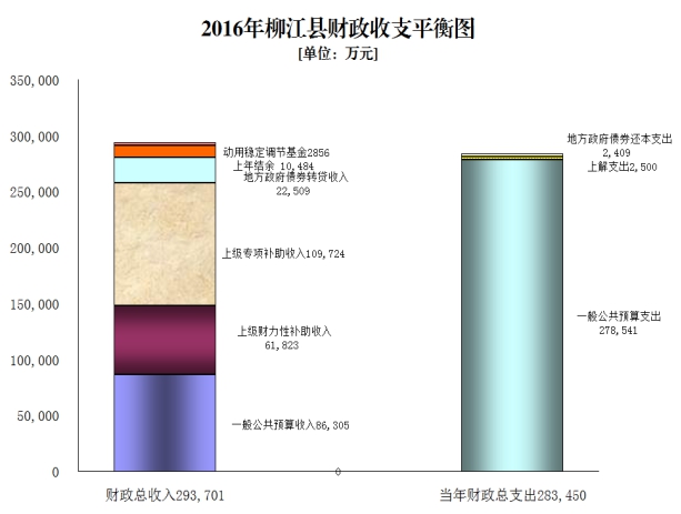 2016年全县财政总收入293,701万元,当年财政总支出283,450万元,收入和支出相抵,年终结余9,206万元,补充预算稳定调节基金1,045万元。