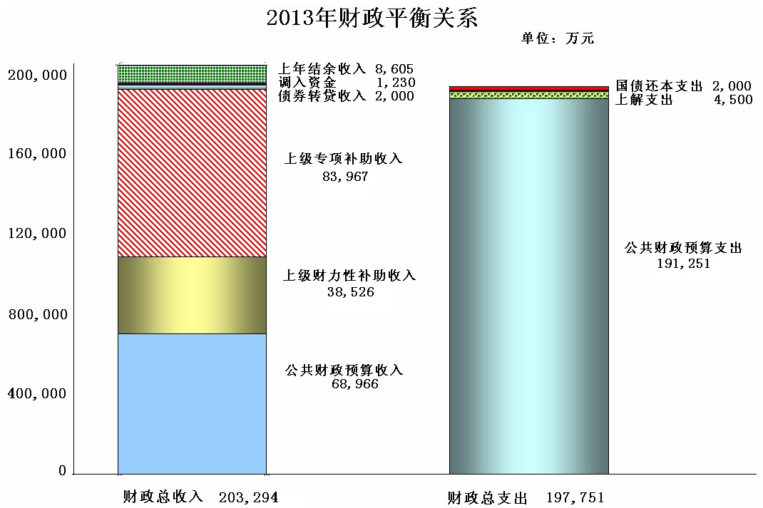 2013年,全县财政总收入203,294万元,财政总支出197,751万元,收入和支出相抵,年终滚存结余5,543万元。