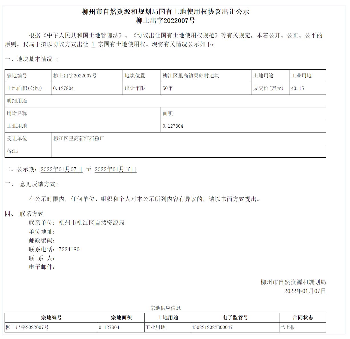 柳州市自然资源和规划局国有土地使用权协议出让公示柳土出字2022007号