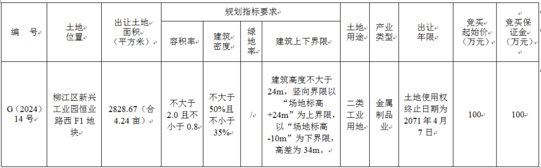 1、竞得人须按以下标准实施建设:①自土地交付之日起18个月内建成并投产;②项目固定资产投资强度不低于267万元/亩;③项目投产后,年工业总产值不低于326万元/亩;④项目达产后,年上缴税金(含减免税金)不低于24.6万元/亩;⑤该地块不具备独立开发条件,应与东侧用地面积为27643.27m²的地块整合后统一开发建设,地块整合后的有关城市设计和配套要求等按“柳资源规划条件〔2020〕368号”规划设计条件相应要求执行。整合后地块控制容积率不大于2.0且不小于0.8,建筑密度不大于50%且不小于35%;⑥环境标准:项目投产后按相关行业标准达标排放。