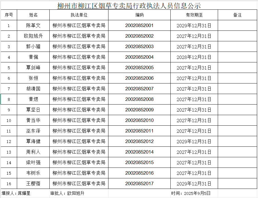 柳州市柳江区烟草专卖局行政执法人员信息公示