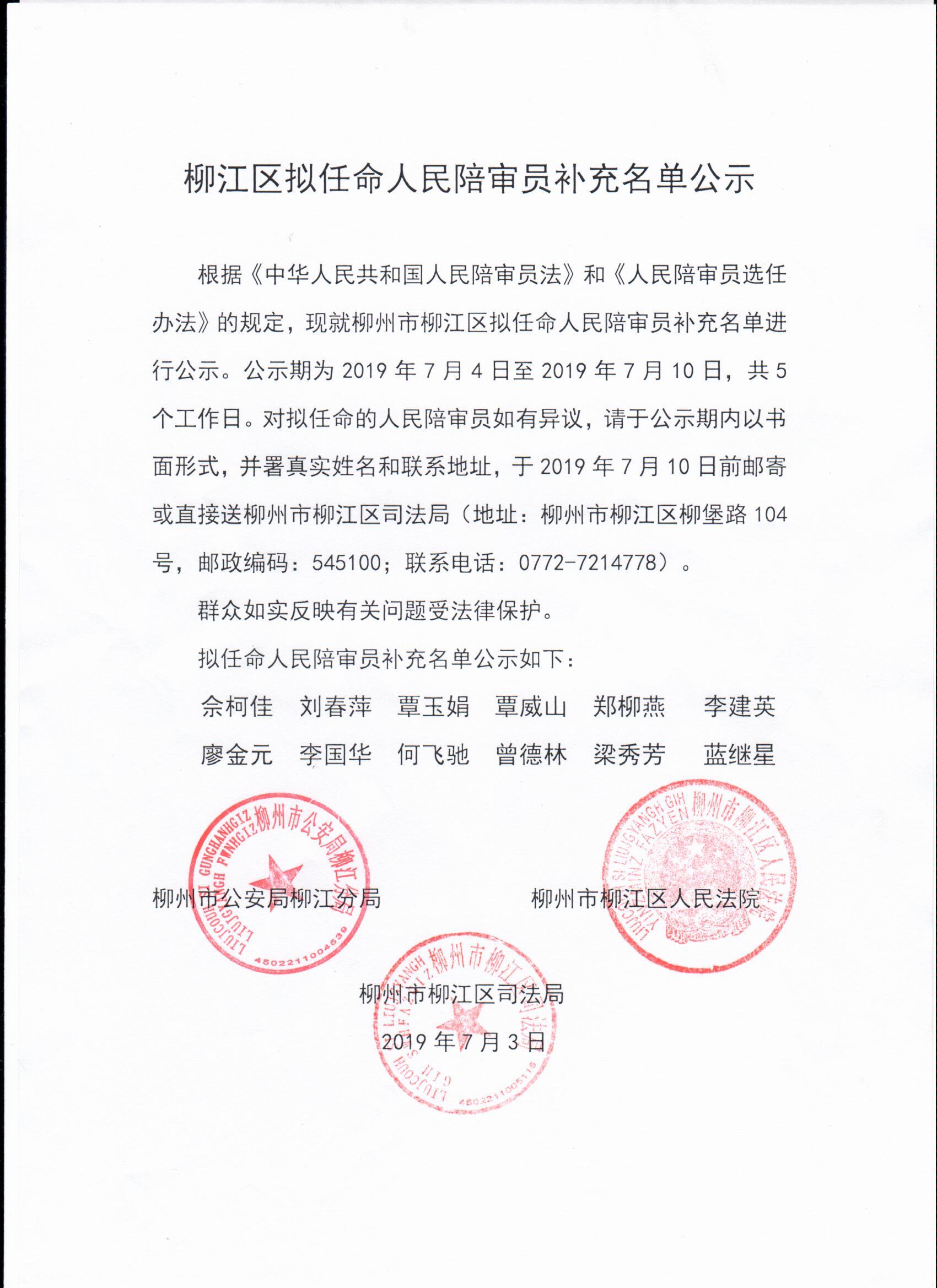 根据《中华人民共和国人民陪审员法》和《人民陪审员选任办法》的规定,现就柳州市柳江区拟任命人民陪审员补充名单进行公示。公示期为2019年7月4日至2019年7月10日,共5个工作日。对拟任命的人民陪审员如有异议,请于公示期内以书面形式,并署真实姓名和联系地址,于2019年7月10日前邮寄或直接送柳州市柳江区司法局(地址:柳州市柳江区柳堡路104号,邮政编码:545100;联系电话:0772-7214778)。
