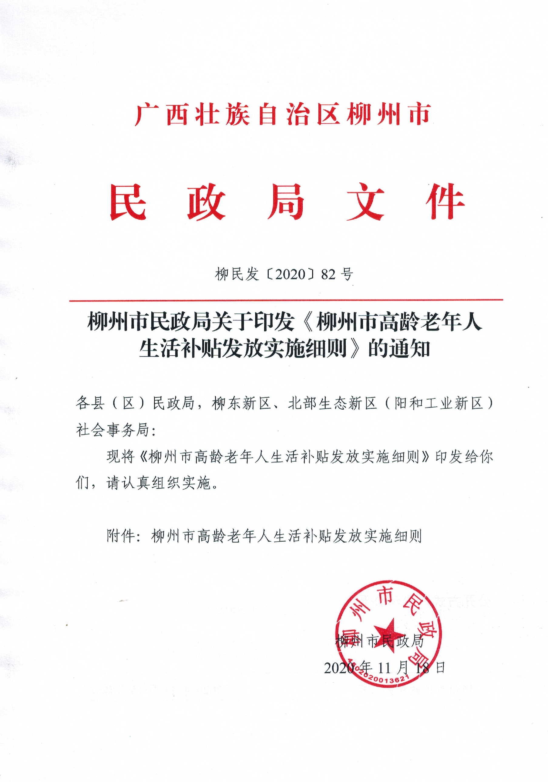根据《柳州市老年人优待办法》(柳政办〔2014〕132号)、《柳州市人民政府关于给予高龄老人发放生活补贴有关问题的批复》(柳政函〔2014〕298 号)、《柳州市高龄老年人生活补贴发放管理暂行办法》(柳民规〔2020〕5号)的有关规定和我市实际,为认真做好高龄老年人生活补贴(下文简称高龄补贴)发放工作,特制定本实施细则。