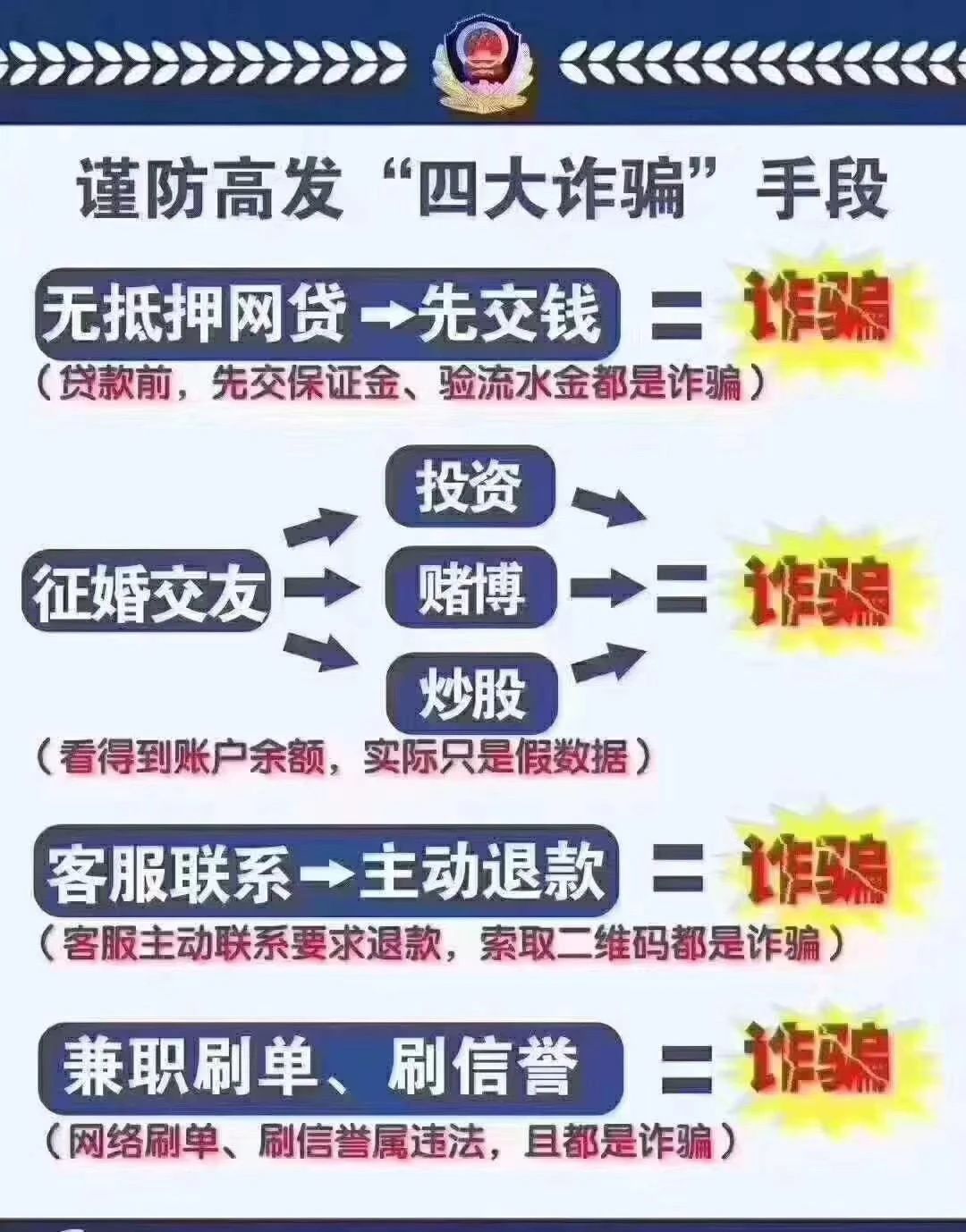 近期,武汉市公安局全局共受理电信网络诈骗案件30起。从损失金额数来看,共计诈骗损失金额为116.09万元。犯罪分子作案手段涉及:平台刷单诈骗(14起,占比46%)、贷款、代办信用卡类诈骗(5起,占比16%)、网络交友诱导赌博、投资诈骗(3起,占比10%)、Q仔类诈骗(2起,占比0.6%)、冒充购物客服退款诈骗(2起、占比0.6%)、平台投资类诈骗(2起,占比0.6%)、其他购物消费(1起,占比0.3%)、游戏币、************诈骗(1起,占比0.3%)。案例一:5月10日,家住江岸区幸福街阳光丽景小区B女士,通过某app找兼职。添加了一个微信,对方称在网上刷单可以赚钱,给B女士在京东上面安排刷单,是一个价值100多元的加油卡,B女士刷了之后,对方返还本金和佣金(8元)。之后B女士陆续按照对方的操作刷了好几笔,但是对方未返还本金和佣金。B女士便不想刷单,想让对方把钱退还时,对方没有退钱。B女士感觉被骗,共计6500元,遂报警。案例二:5月9日,家住江岸区温馨苑小区A女士,在微信群内看到有人打广告招兼职网上刷单,加对方微信好友,让其下载某聊天软件,教其如何刷单。对方让A女士进入一个商品链接,点击购买的时候退出不要支付,并发了一个私人银行账户,前三次都有返利,后来分别刷了1899元、5499元、8999元,等刷完后,被告知其刷错了。A女士怀疑被骗报警,总计损失人民币1.63万元。案例三:5月8日,家住江岸区汉口新城公园世家小区C女士QQ邮箱接到一封推荐刷单的邮件,通过添加QQ好友,对方发来某商城的链接,称只要在商城购物并通过银行卡转账付款就能获得3元每单的佣金,通过扫码方式支付后,对方将30元佣金通过支付宝转给C女士,但未退还600元本金,并称需要再刷单8件才能退还本金,C女士通过银行卡转账方式向对方多次转账后发现被骗并报警。警方提醒:切勿相信网上类似“足不出户,日进斗金”“轻轻松松赚钱“等兼职广告。即使是熟人介绍工作也未必靠谱,自我甄别是前提,坚决拒绝任何需要提前垫资的兼职工作。轻勿点击陌生链接或扫描陌生二维码下载非法、假冒App,一旦发现被骗,保存好对方的电话号码、QQ、微信、聊天记录等资料,及时报警。案例一:2020年4月21日,家住江岸区石桥花园小区的群众B称有一网友通过微信美食群加好友,通过验证后起初并没有开始聊天。从5月1日开始相互闲聊,通过5天的网聊,对方博取了B的信任,并在5月5日,聊天时提起了理财项目,且对方告诉B如果担心的话就可以先投资少一点,随后对方用微信发了一个二维码给B下载某投资APP进行操作。B第一次投资金额为800元钱,按照对方告知流程进行操作盈利90元,并且成功提现。接下来三天,按照对方的规定B开始连续三天的投资了三次都得到了返利并且可以提现(尝到甜头)。后对方说可直接投资20万元,投资的20万元钱可以放在APP中,不但有隔夜彩金的分红还可以方便明天大金额的投资,B当时就按照对方所说的去做了。直到5月9日操作该APP,在没有这名网友的情况下B自己操作提现,发现人工服务均是智能回复,APP里的21万元也提不出来,后来对方告诉B称必须加10万元钱进去投资才能提现,B后来并没有操作,发现有问题于是选择报警了。案例二:家住江岸区惠西小区的C女士在4月份时,接到陌生人电话,对方自称为某软件客服,要退还服务费。想到在5年前购买过此软件,所以相信了对方。对方邀请加入到微信群后,群内讲师称需要下载一个数字交易软件。C女士在5月6日、8日、11日分别向该软件充值6.69万元、1.79万元、2.99万元人民币后(共计11.497万元),发现该软件被关闭,不能进入。遂即前往报警。第一步:诱惑。骗子在网络上传播、购买“外汇、贵金属、期货、指数”等,用“理财专家”“炒股专家”“金牌讲师”“高额回报”等字眼诱惑受害人。第二步:小利引诱骗取信任。投资人在第三方平台进行投资后,开始让投资人获得些许利润,取得受害人信任。第三步:继续诱导。利用手头上有“内部消息”“大行情”等虚假消息诱导投资人加大投资额度。第四步:诈骗成功,销声匿迹。待受害人继续投钱进平台亏本后,谎称“账户异常”“爆仓”等情况致使投资人血本无归。不仅如此,案犯一旦得手就立即解散,销声匿迹。