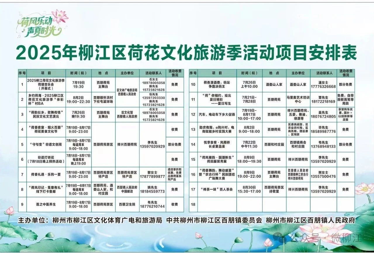 据了解,2025柳江荷花文化旅游季持续至8月17日。游客可乘兴穿梭于荷塘间,在非遗文创周里触摸传统匠心,在荷花美食节大快朵颐,感受荷田服装秀的国风雅韵、村BA篮球赛的热血激情,更有周末限定的非遗打铁花。无论您想体验民俗、尝鲜寻味,还是沉醉于艺术与运动的魅力,这场荷花季都能满足您。快来柳江百朋荷苑,共赴这场为期一月的夏日狂欢,在荷香与光影中,镌刻难忘的夏日记忆。