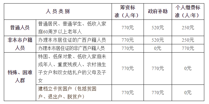 根据《广西壮族自治区医疗保障局 广西壮族自治区财政厅 国家税务总局广西壮族自治区税务局关于做好2019年城乡居民基本医疗保障有关工作的通知》(桂医保发﹝2019﹞23号)文件精神,我市城乡居民基本医疗保险2020年度个人缴费标准,按照不低于250元的标准执行,同时政府补助标准也提高到520元人/年,参保人全年筹资标准为770元人/年,特殊、困难人群个人无需缴费。个人缴费应在规定的缴费期限内按年度一次性缴纳。(国家对个人缴费有新规定,从其规定)。