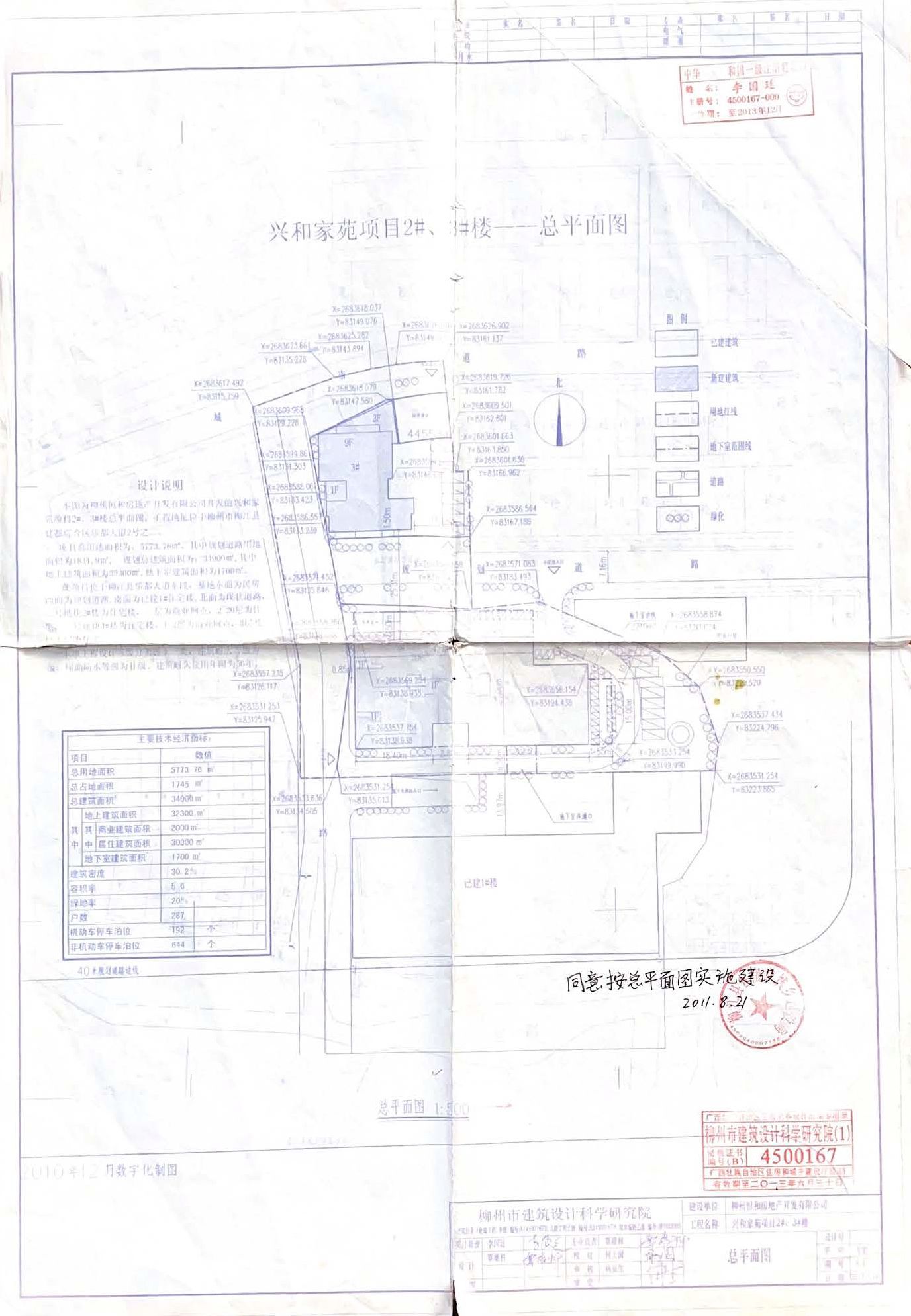 根据2011年8月21日我局批准的《兴和家苑项目2#、3#楼总平面图》,项目建设用地面积5773.76㎡,总建筑面积34000㎡,建筑密度30.2%,容积率5.6。机动车位192个,非机动车位644个。