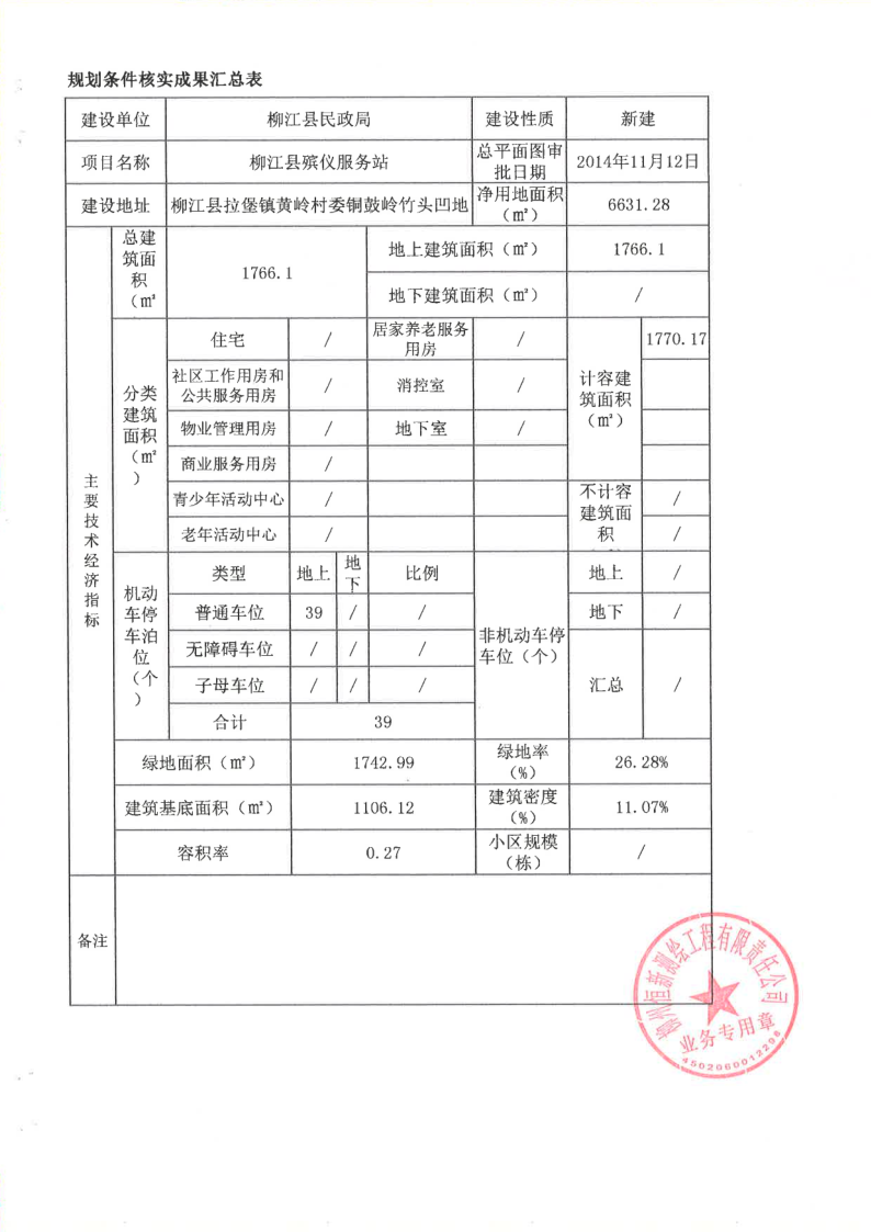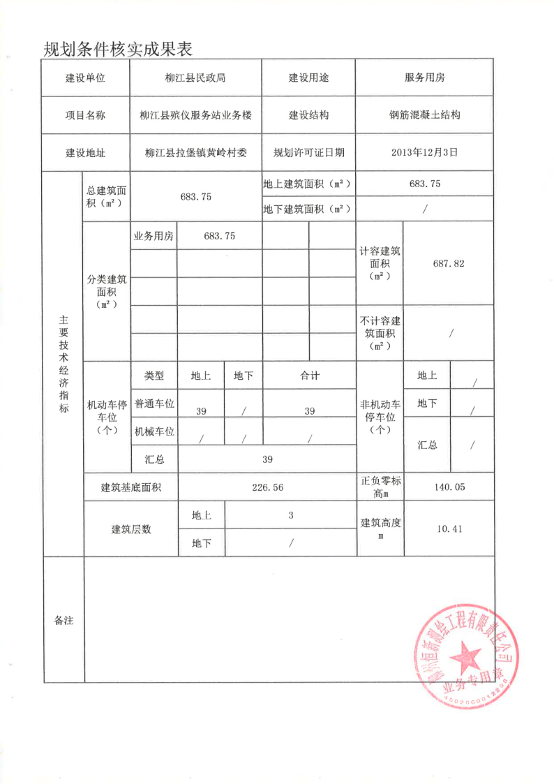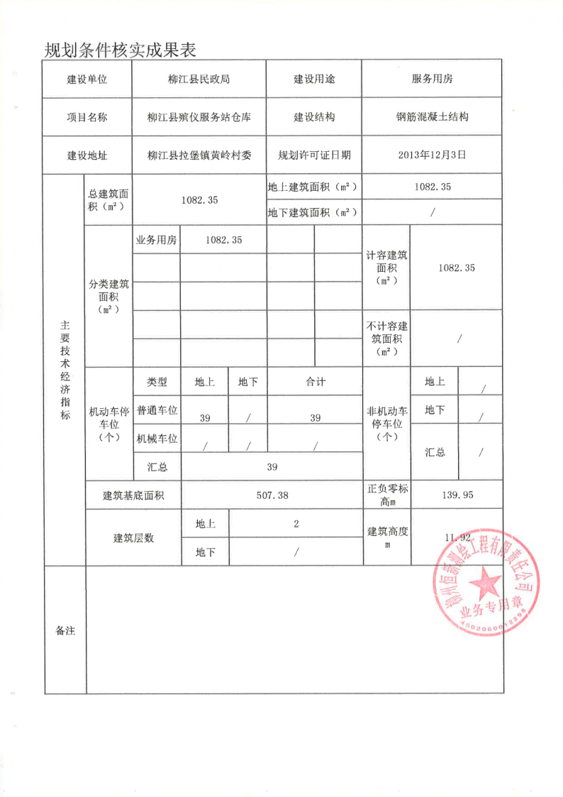 项目已建设完成,依据柳州恒新测绘工程有限责任公司2018年1月3日实测报告,柳江区殡仪服务站业务楼地上建筑面积为683.75㎡、仓库地上建筑面积为1082.35㎡。机动车位39个。