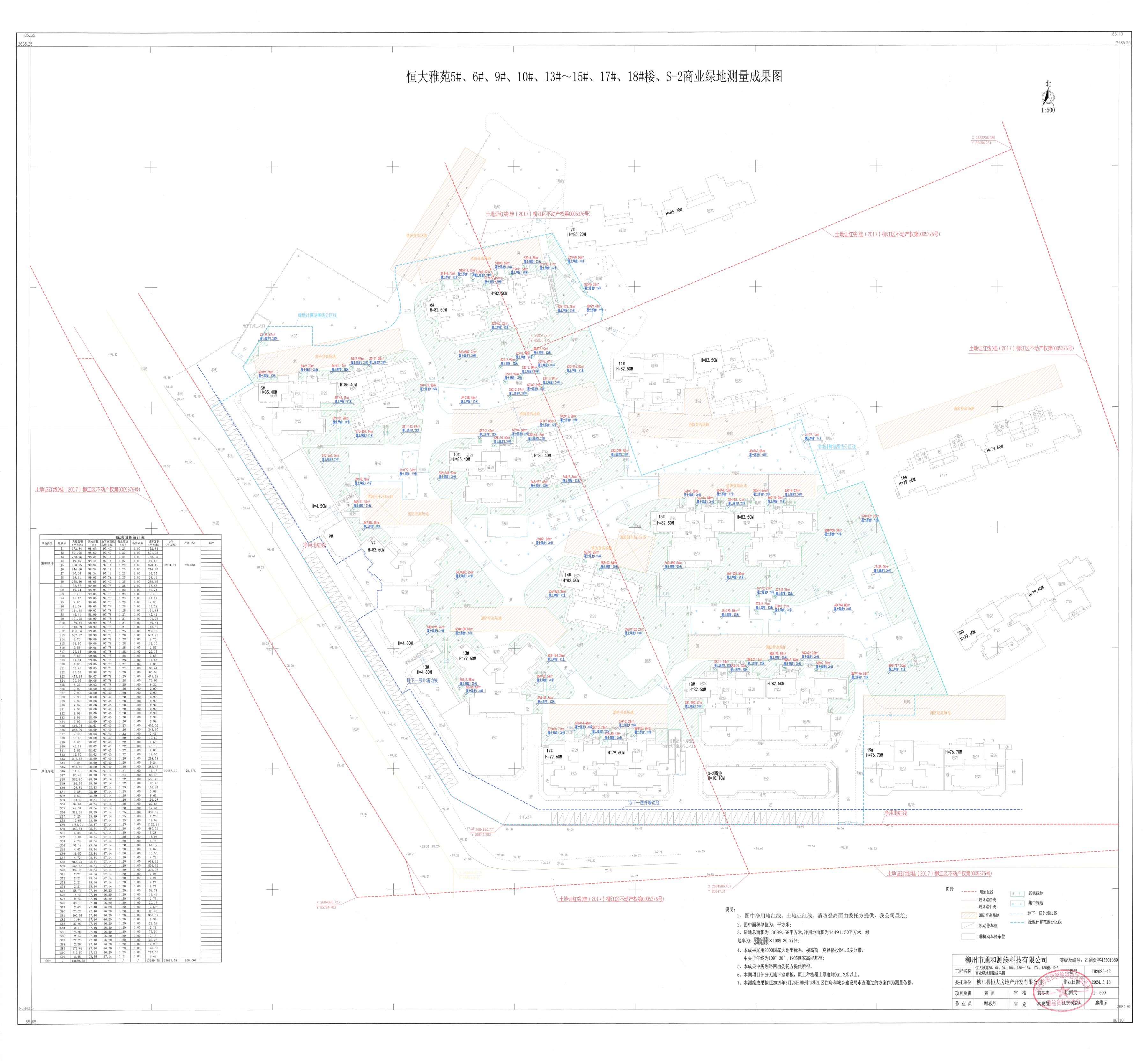 该项目已建设完成,依据柳江县恒大房地产开发有限公司提供的第三方测绘材料,本次核实范围内绿地面积为13689.58平方米,净用地面积为44491.5平方米,绿地率为30.77%。